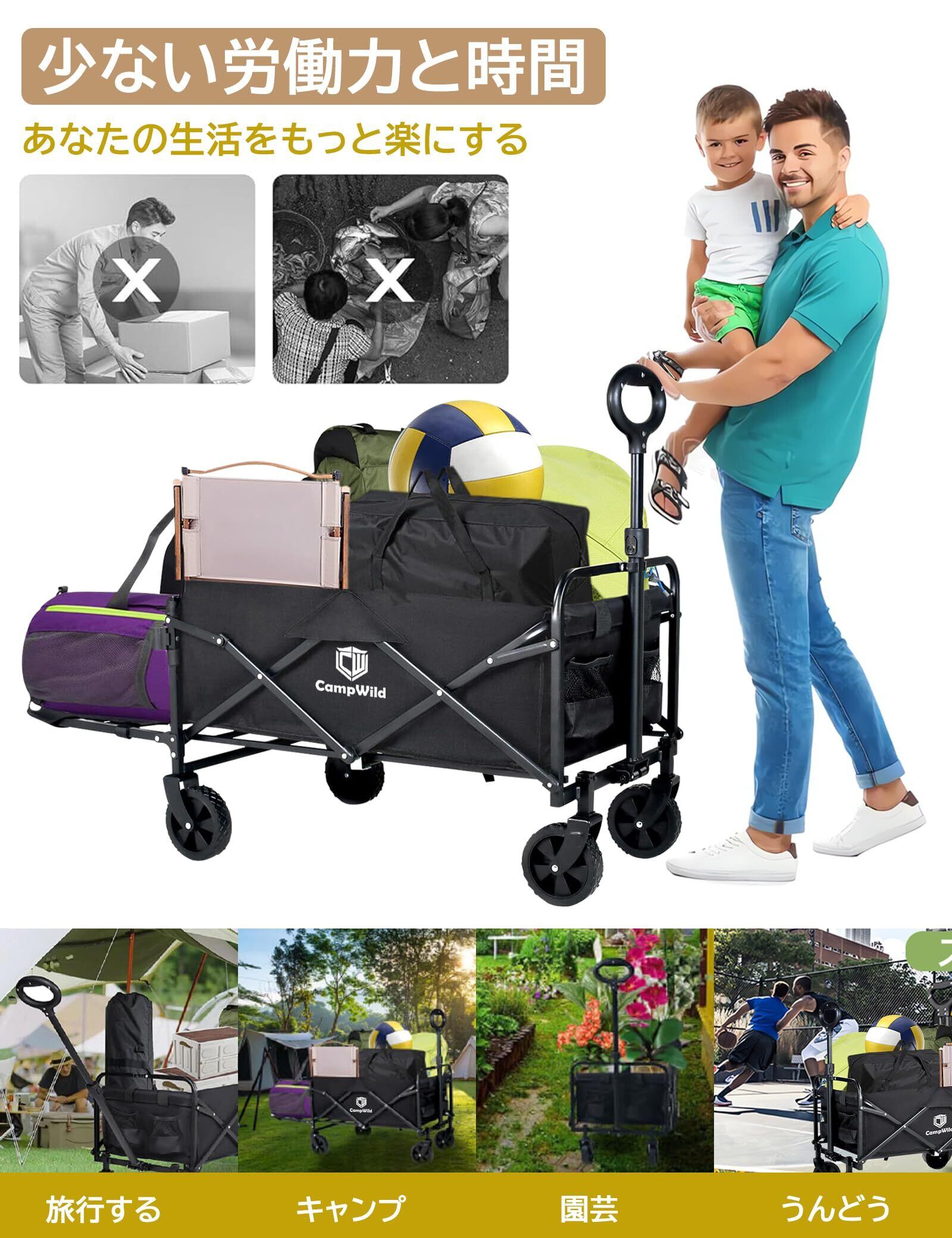 【新春セール】アウトドアワゴン 折りたたみ キャリーワゴン 自立収納式 後ろ開けキャンプワゴン 長物対応 容量が30%増加 耐荷重120kg コンパクト大容量 オックスフォードタープン アウトドア レジャー 買い物 釣り ビーチ パティオ BBQ (130L) (黒色)
