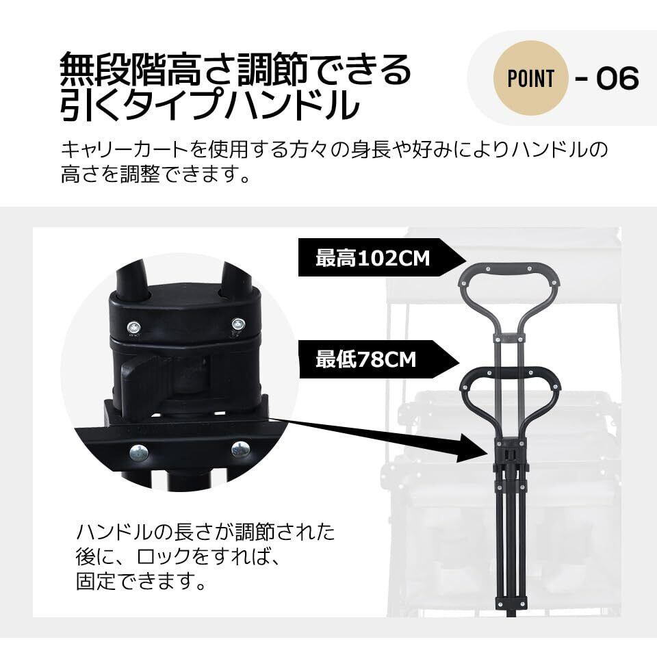 01 アウトドアの時に便利!様々なシーンで大活躍!1.運動会に お弁当、テーブル、レジャーシートなど、たくさんの荷物を一回だけで運べる!2.まとめて大量のお買い物に 16.キャンプやパーティーに。小物入れメッシュポケットが、引くタイプハンドル側についています。飲み物などを一時入れて、とても便利です。 02 このキャリーワゴンは屋根付きワゴンには希少な160L大容量であるため、重い荷物でも一度に楽に大量に載せることができます。また、荷室の四隅は自由に開閉できるジッパー仕様で、四隅のジッパーを下ろせば、テントやパラソル、釣竿などの長物も収納可能です。キャンプや運動会、海水浴など、様々なシーンで活躍してくれます。 03 耐荷重100KG、一度だけで多くの荷物が運べる! 休みにピクニックに出かける場合、キャンプ道具などの持ち運びを快適にしてくれあます。耐荷重100KG、積載スペースも広くて、アウトドアチェアなど必要なアイテムを楽々入れます。何回も運ぶ必要はなく、一度に運ぶだけで快適なテントライフをより早く始めましょう! 04 カバー取り外し可能、手洗いもOK カバーとフレームはマジックテープで固定されているので、汚れてしまっても、簡単に取り外せます。お手入れができ、洗えるので、いつも清潔なままアウトドアしましょう! 05 折り畳み式+自立可 引き上げるだけのワンタッチ折り畳み式、簡単に収納できます。キャリーカートを使用する方々の身長や好みによりハンドルの高さをも調整できます。ハンドルの長さが調節された後に、ロックをすれば、固定できます。同色の収納カバーも付いているので、ほこりから守り、よりコンパクトに折りたためます。自立可タイプで、手を放しても倒れません。置き場所にも困らない。