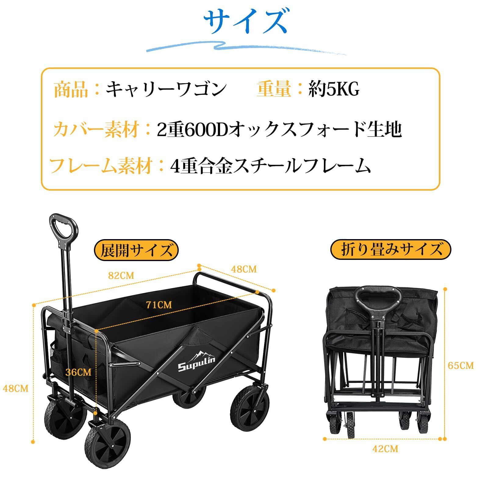 ✨【重い荷物も1度で運べる大容量】Supulinのキャリーワゴンはしっかりとしたスチールフレームに加え、100kgの耐荷重が実現できます。100L大容量でたくさんの荷物も1度で運ぶことができます。荷物が多くなりがちなキャンプでも一度にたくさんの荷物を運べるので、車とサイトの間を往復する手間が減べます。手持ちでは25kg程度しかもてないものの、キャリーカートを使えば手持ちの4倍以上の100kg程度を一度で運べます。