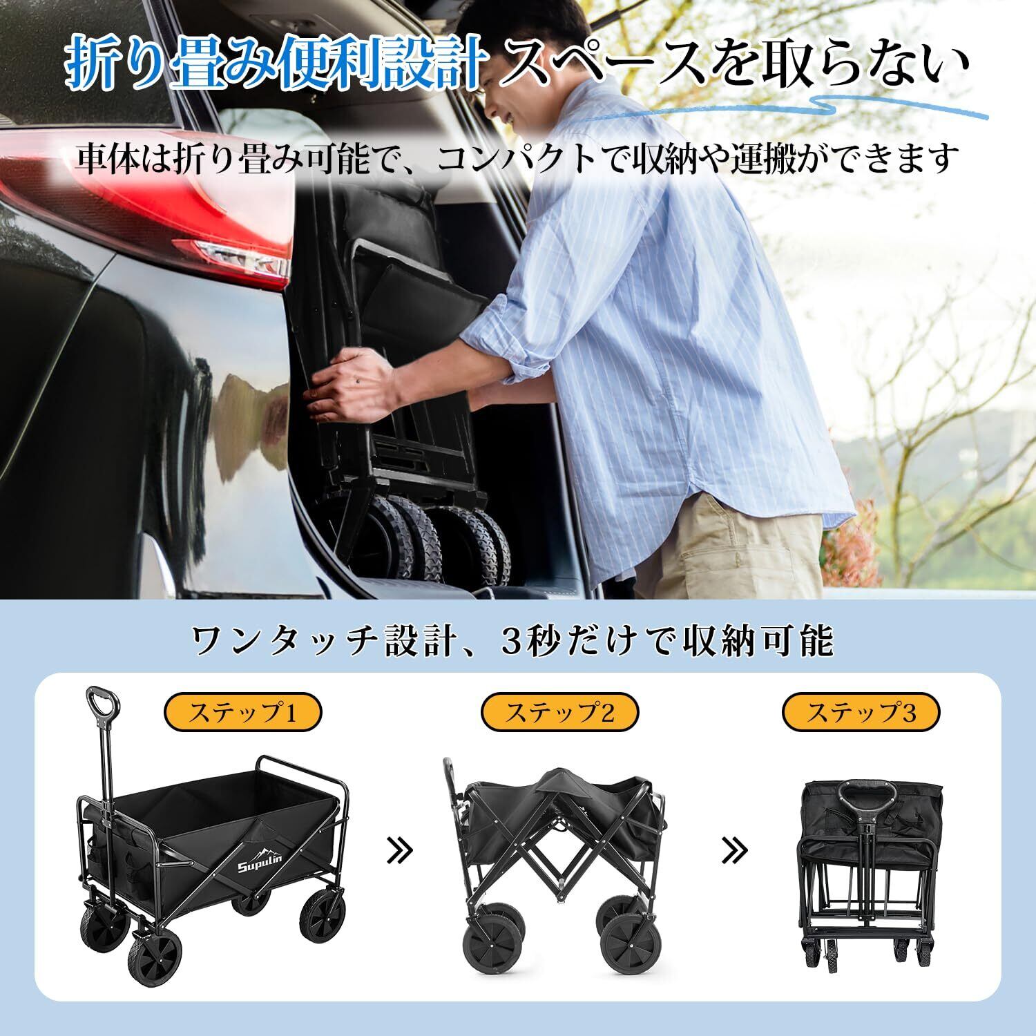 ✨【折りたたんだらコンパクト】Supulinのキャリーカートは、簡単に折りたたで収納できます。組立不要でわずか数秒で即時使用可能です。フレームを広げるだけであっというまに組み立てもできます。女性一人でも楽に折り畳め、類似品で最小級の収納サイズなので、どこに置いても場所を取らず、車載スペースも十分確保できるので他の荷物の邪魔になりません。収納性が驚くほど高く、とにかくコンパクトな設計です。