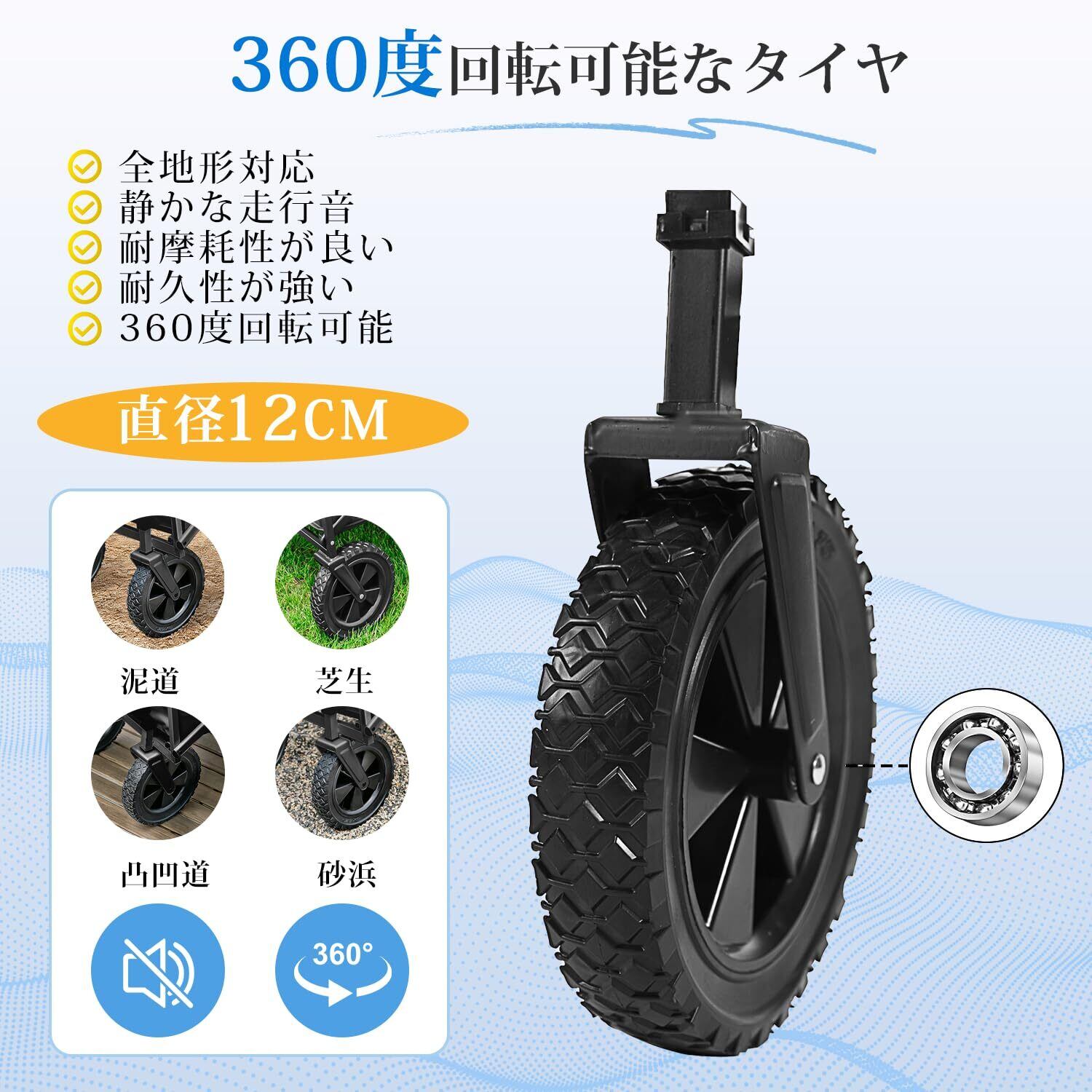 ✨【悪路でも安定するタイヤ】高強度、高スプリングバック、高耐摩耗性、高い引裂き耐性などの特性を有したポリウレタンタイヤを採用します。重い荷物をのせて段差のある場所、芝生や凸凹道、ぬかるみ、舗装路、砂利道、砂浜などでも安定して進めます。360°回転する11CMのワイドタイヤが装備されており、未舗装の道路や凹凸のある道などどんな場所でもらくに進めます。キャンプはもちろん、お釣り、運動会、お花見、BBQなど場合でも役立つでしょう。