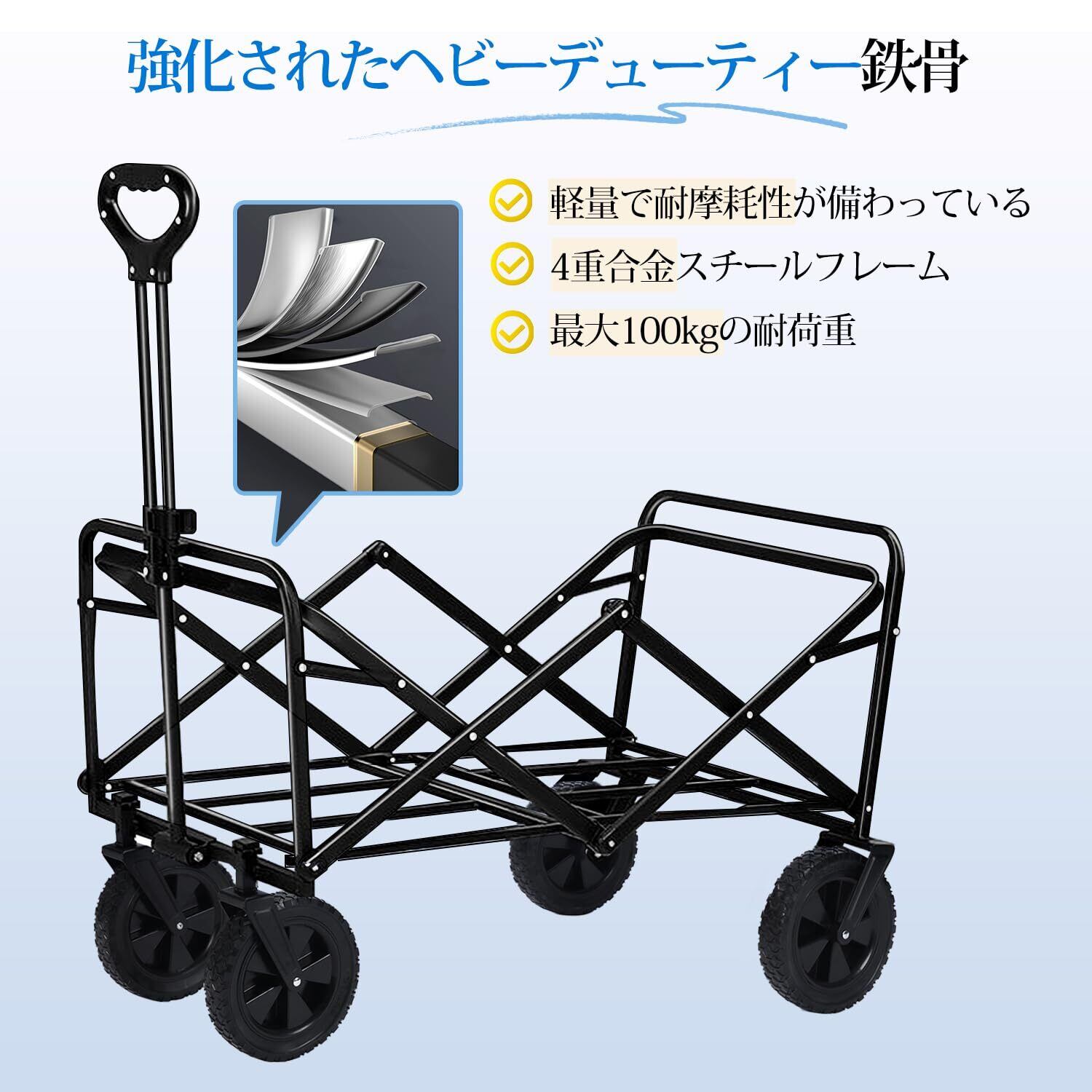 キャリーワゴン キャリーカート 折り畳み 大容量100L 耐荷重100kg アウトドアワゴン キャンプカート ワイドタイヤ 頑丈 軽量 ワンタッチ収束式 コンパクト アウトドア キャンプ 釣り 運動会 花見 ブラック