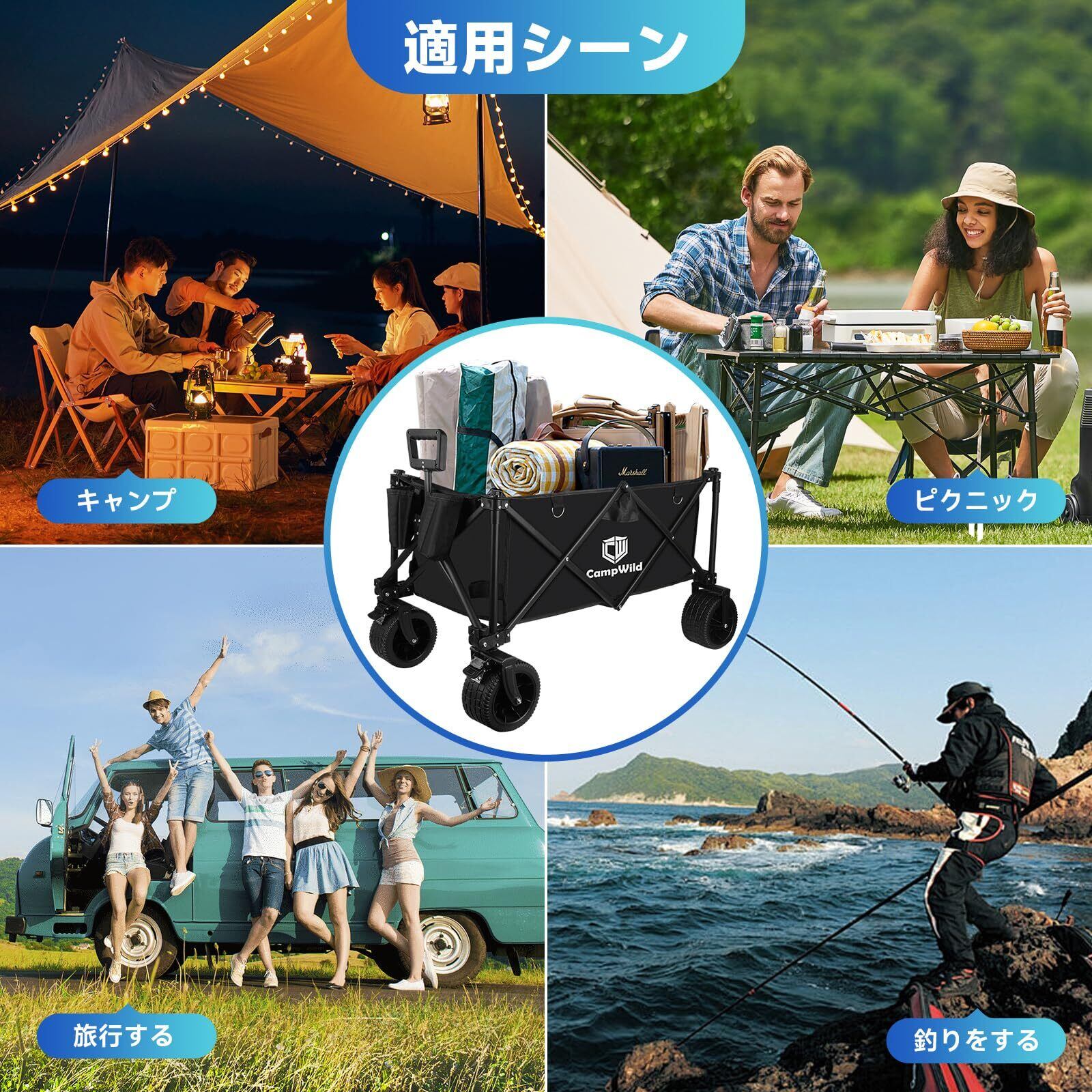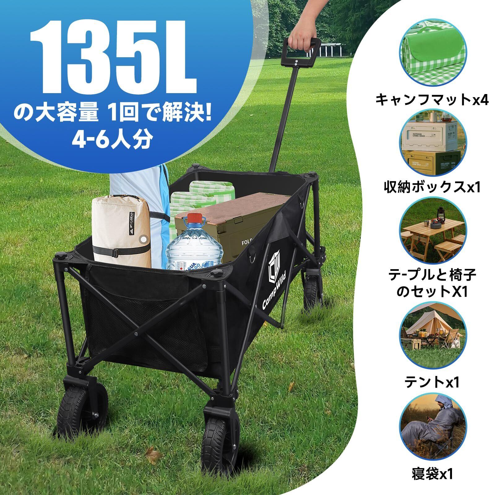 あらゆる場面で活躍:アウトドアワゴンは野外キャンプから街での使用まで、多岐にわたるシーンで活躍します。旅行や買い物、スポーツ用具の運搬など、様々な状況で絶大な便利さを発揮。これ一台で、どんな場所でも物品の移動がスムーズで簡単です。快適でストレスの少ない日常生活をサポートします。