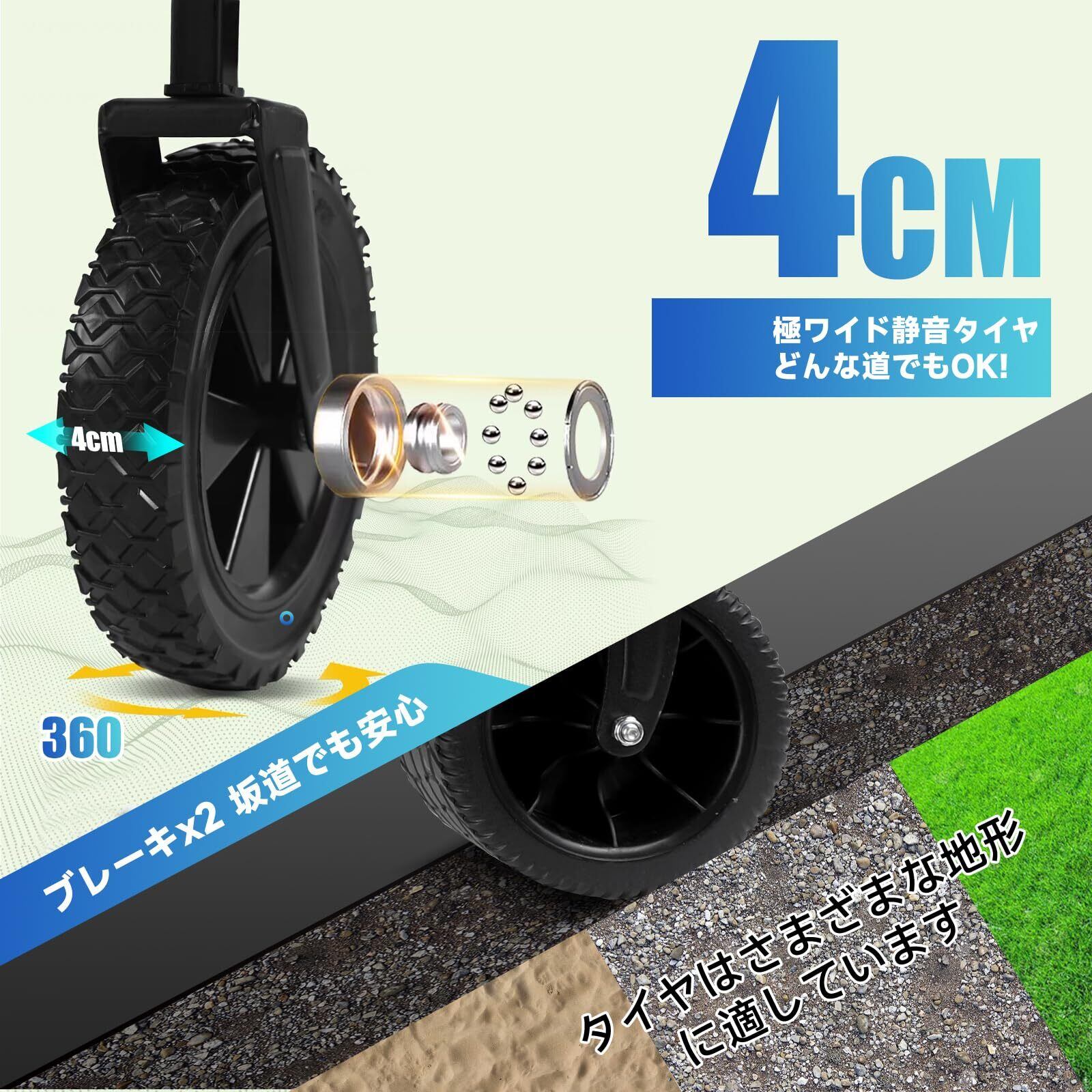 ブレーキ付きのオフロードタイヤ:キャリーカートには、耐摩耗性と耐衝撃性に優れたオフロードタイヤが装備されており、さまざまな地形に対応します。砂地や泥地、河岸の石など、どんな場所でも安全に移動することができます。タイヤの耐荷重能力は優れており、頑丈なフレームには大容量の荷物を積むことができます。さらに、大型タイヤにはブレーキが付いており、いつでも車両のスライドや制御が可能です。