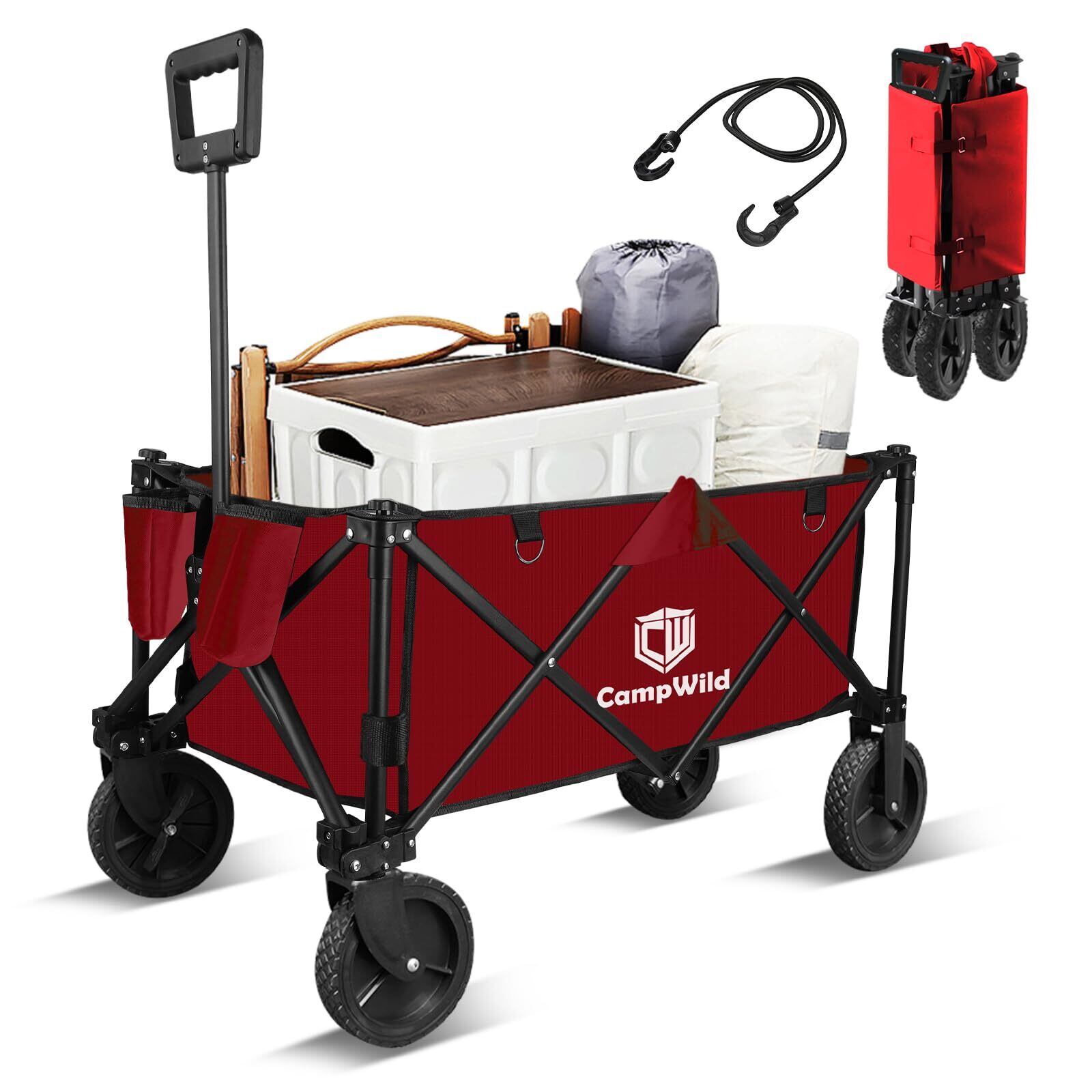 【2022最新】キャリーワゴン アウトドア最適 耐荷重150kg 大容量150L ワイドタイヤ 自立収納 BBQ/釣り/キャンプ/運動会用 サイドブレーキ付き 多機能キャンピングカート (赤色)
