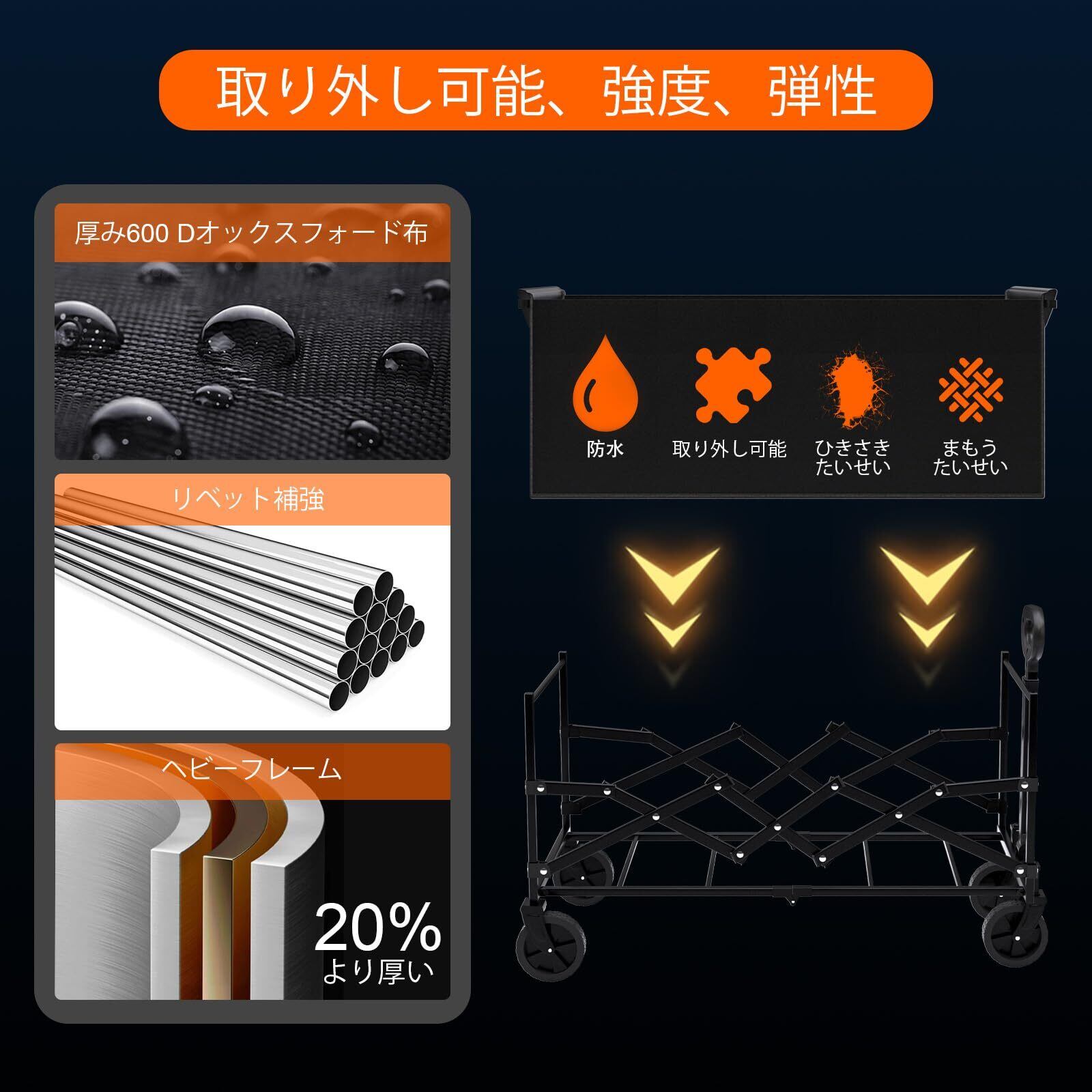 耐久性と信頼性の高い構造:当社のキャリーカート、防錆フレームと丈夫な600Dオックスフォード生地で長持ちするように作られています。防水性と耐引裂性を備えたこの折りたたみ式運搬車は、持ち物を安全に保ちながら、あらゆるアウトドア アドベンチャーに対応できます。