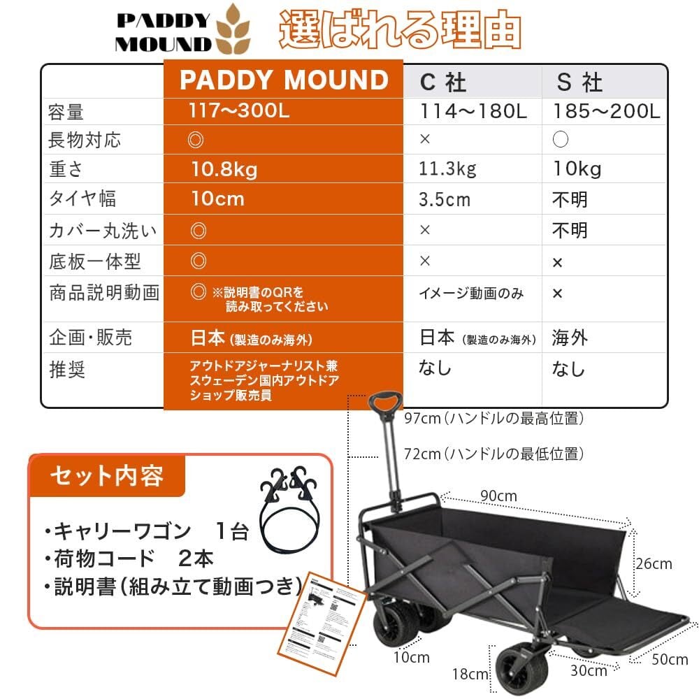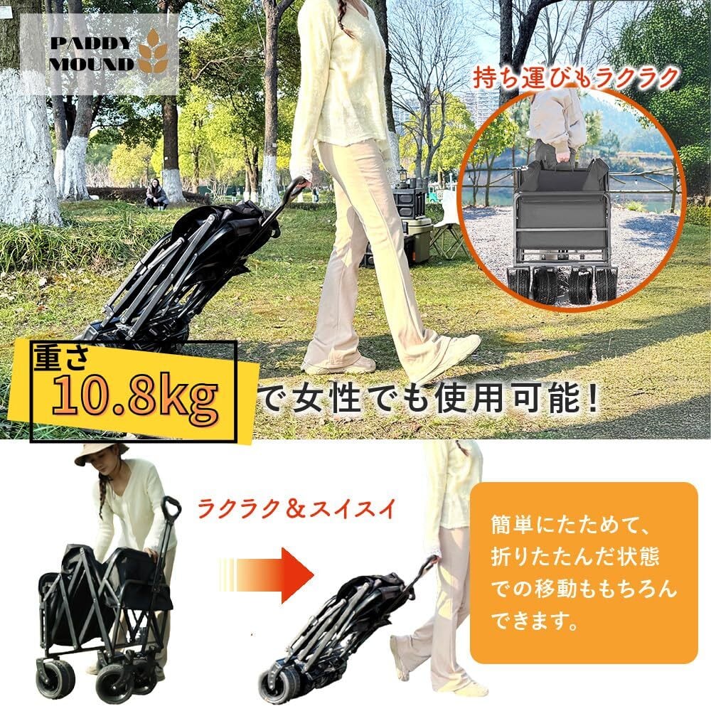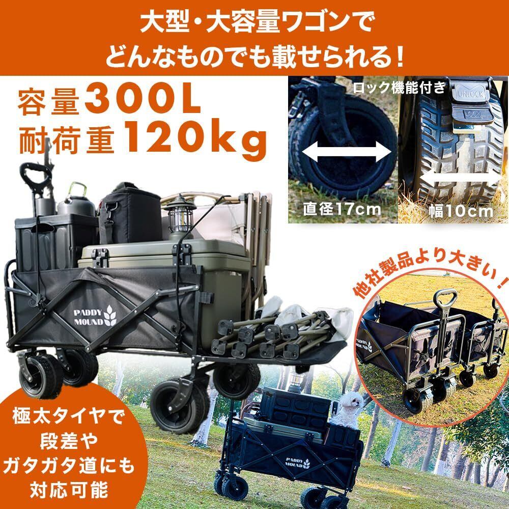 【アウトドアジャーナリスト推奨】 大容量300L 極太10cm タイヤ キャリーカート キャリーワゴン カート アウトドア ワゴン 長物対応 自立 コンパクト 収納 台車 キャンプ