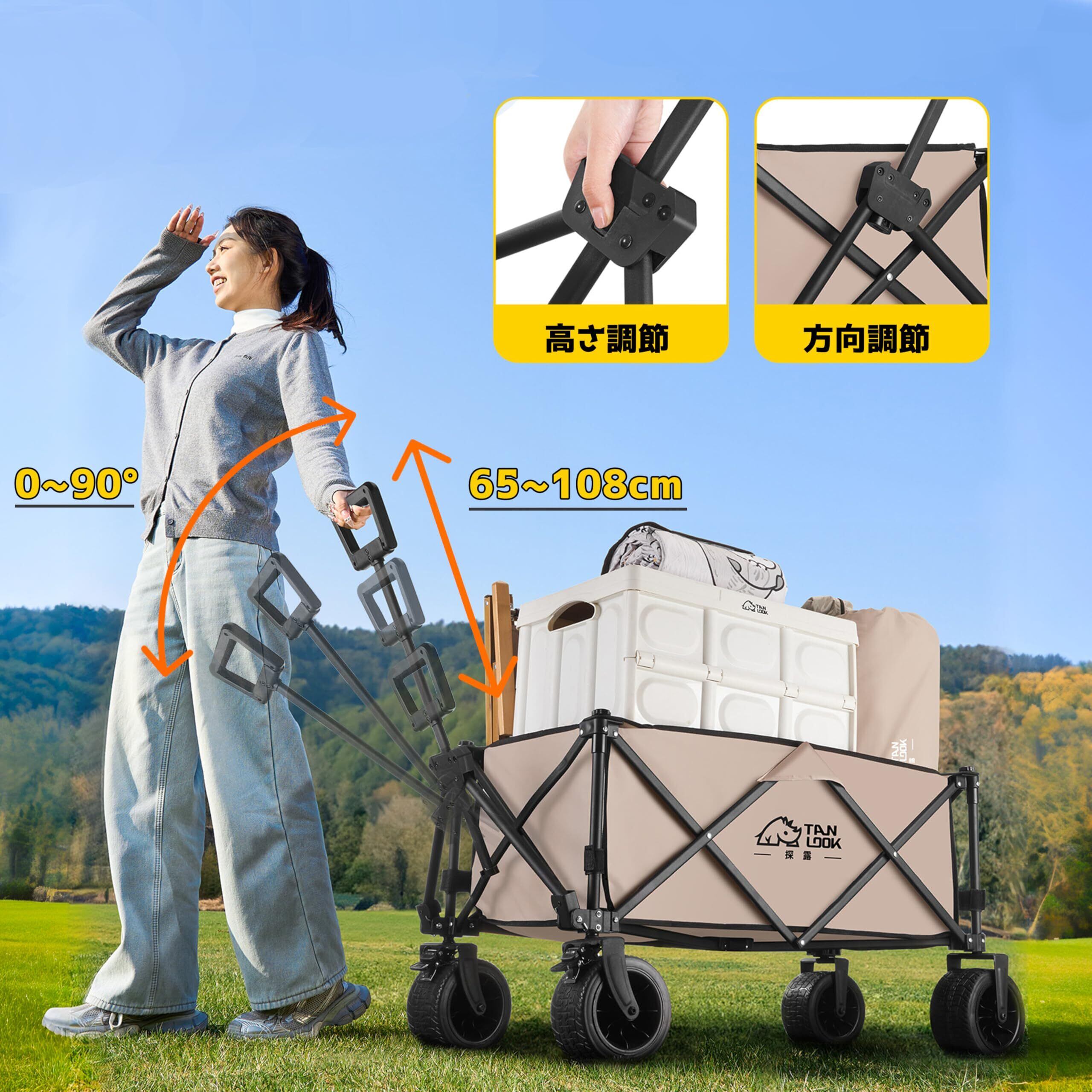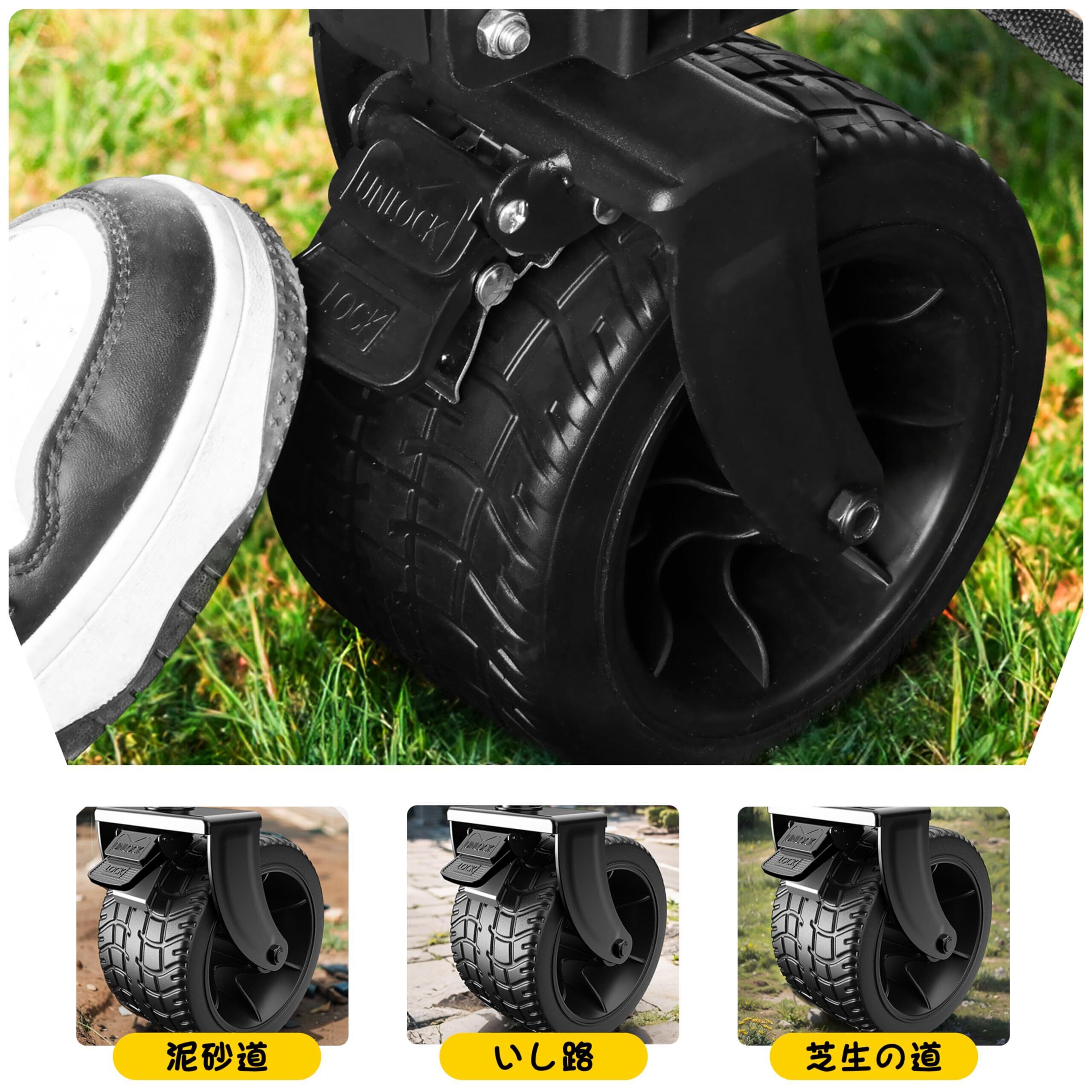 【完全静音設計の超多機能キャリーカート】直径16.5cm静音タイヤ×360°ベアリングが砂利道/階段昇降をスムーズ対応。混雑した商業施設や深夜住宅街でも音ゼロ走行。伸縮ハンドル調節機能付きで、子供から高齢者まで快適な片手操作を実現する折り畳みキャンプ用品の決定版。