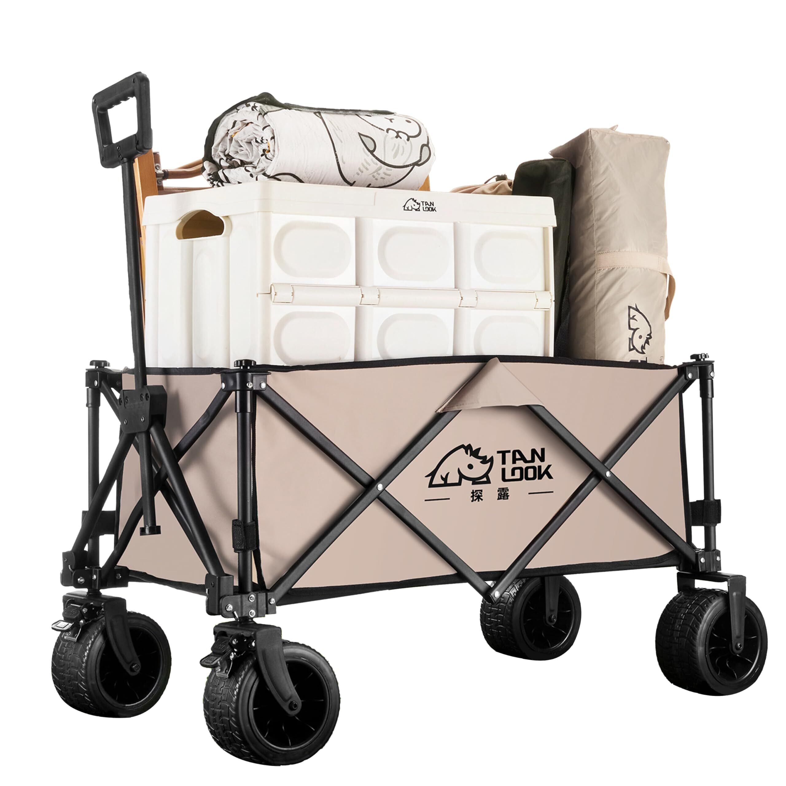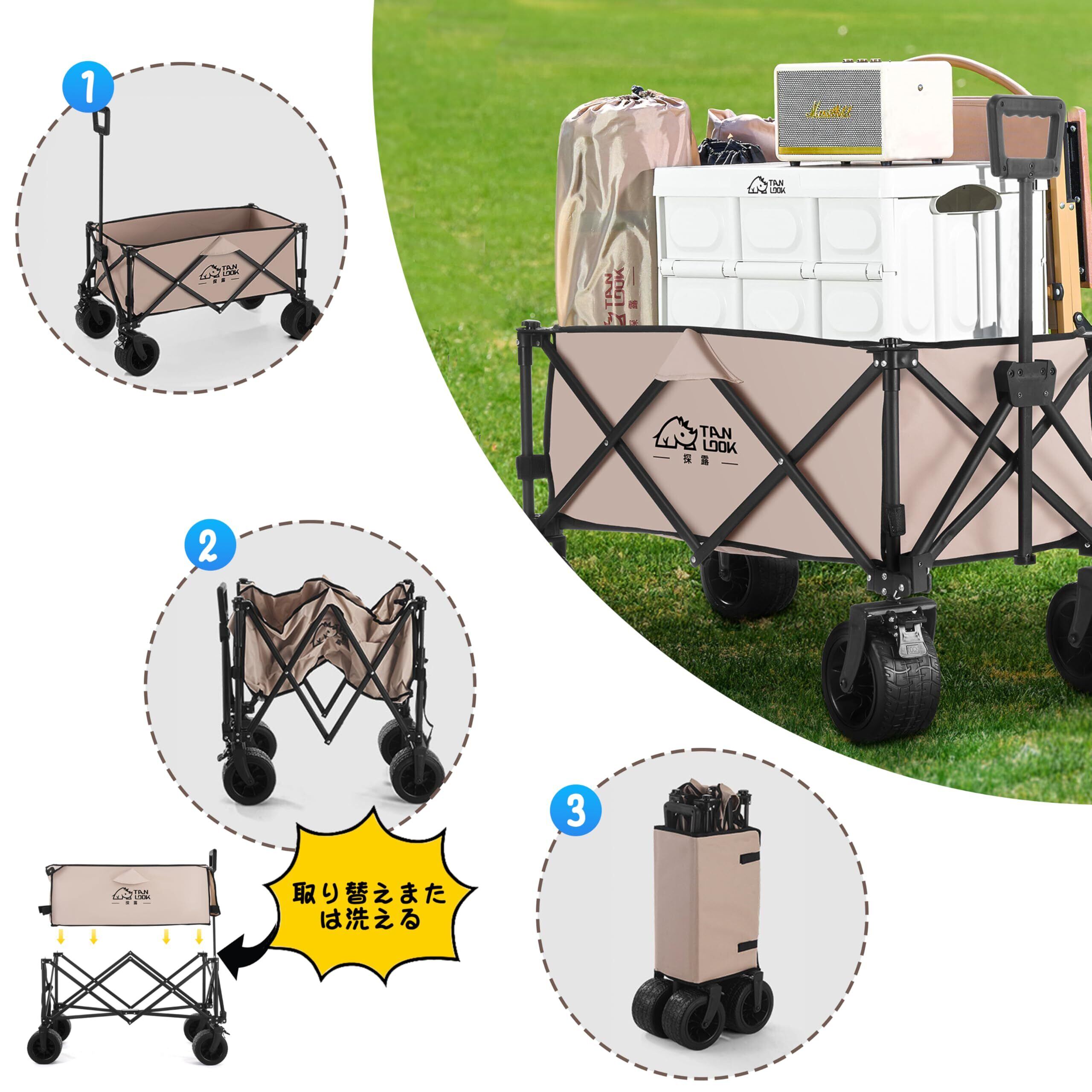 キャリーワゴン アウトドアワゴン 3秒折り畳み 片手操作可能 タイヤ 大容量 150kg耐荷重 多機能キャリーカート コンパクト収納 悪路対応大型ホイール 簡単組み立て式 キャンプ・花見・運動会用 (カーキ)