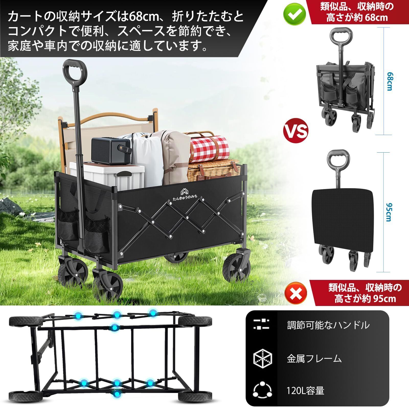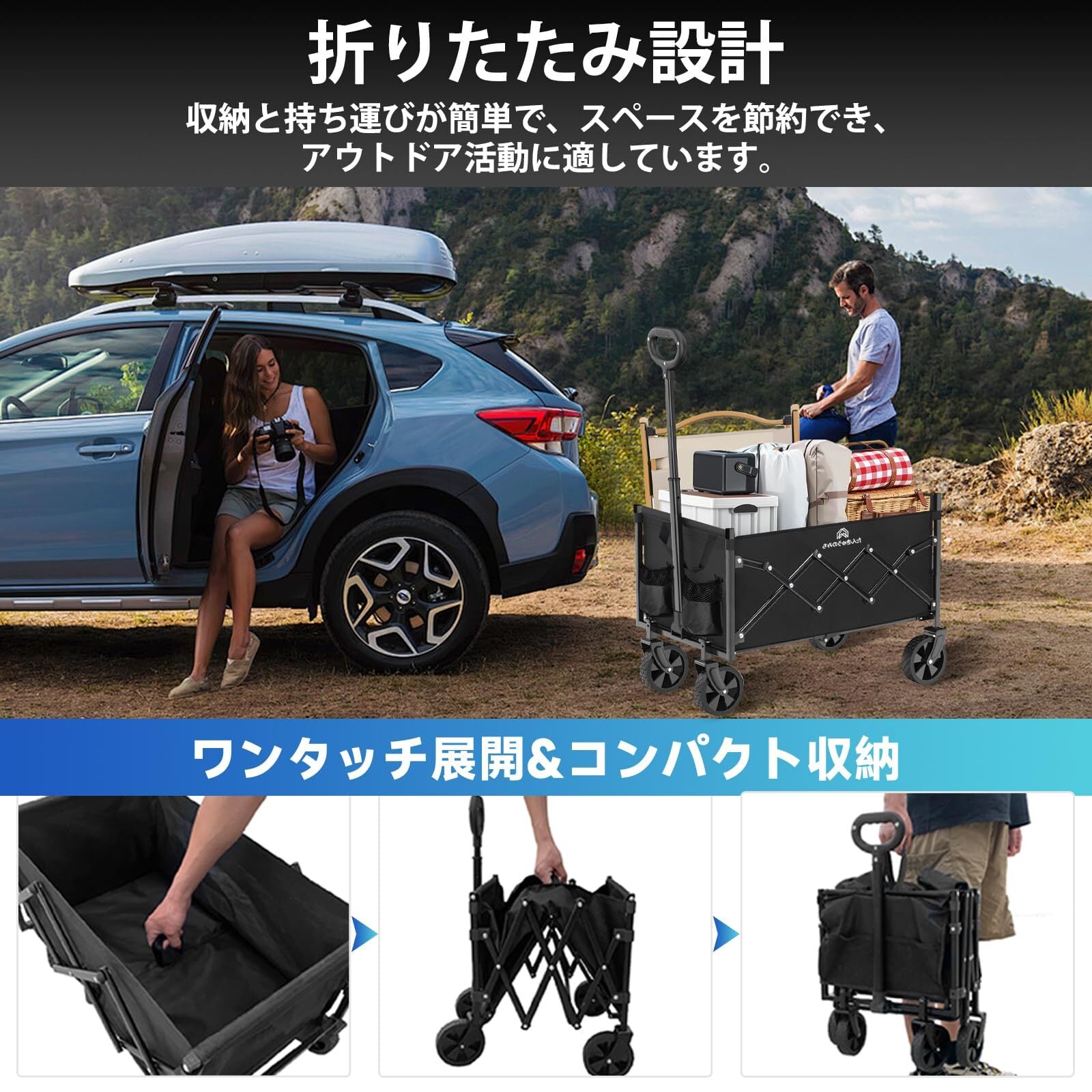 【ワンタッチ折り畳み機能】コンパクト収納可能な折り畳み式設計。展開時68×45×70cmの作業スペースを確保しながら、不要時はスリムに収納。軽量設計で車のトランクや玄関収納にも最適。アウトドアと日常使いをシームレスに繋ぐ携帯性抜群のキャリーワゴンです。