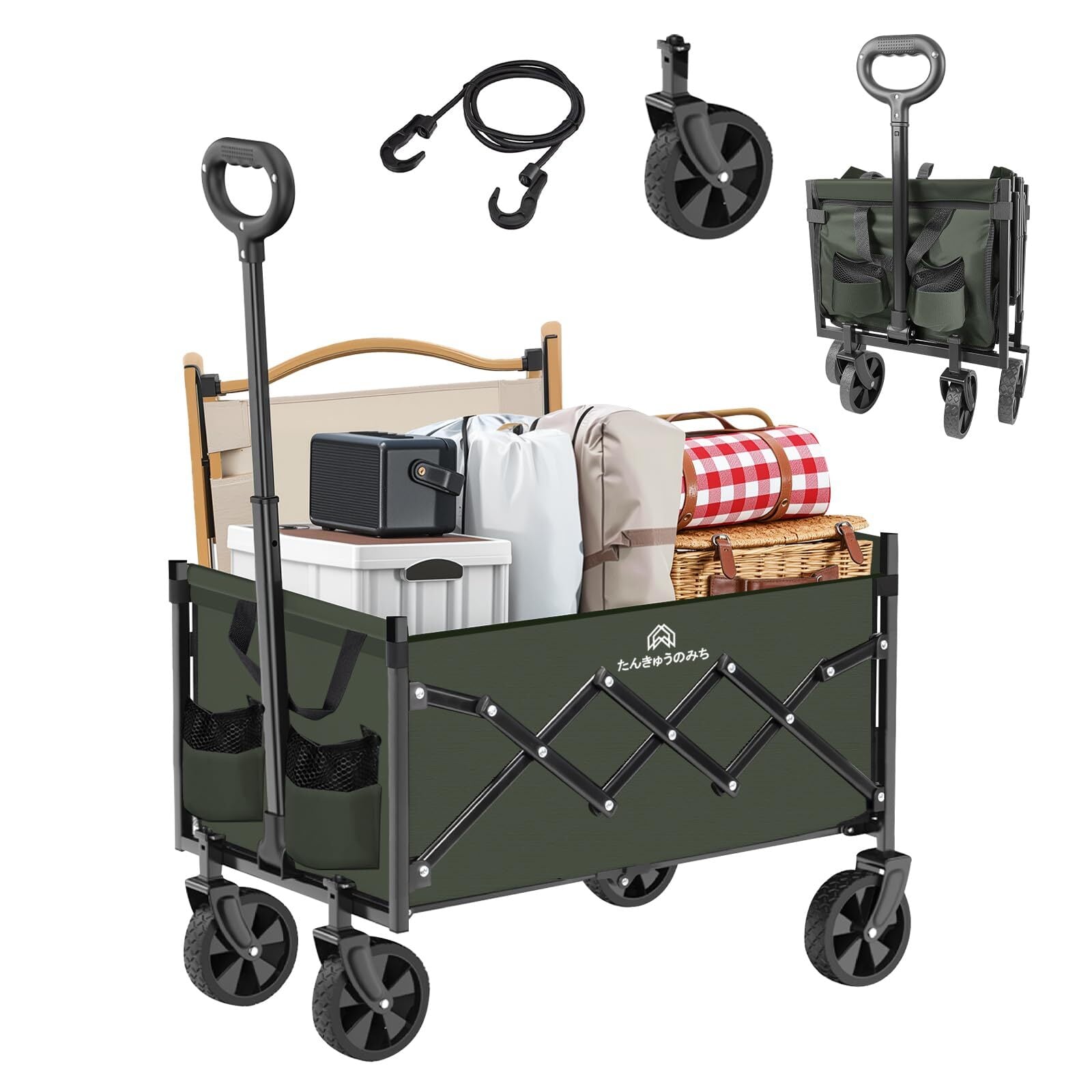 【たんきゅうのみち】キャリーワゴン 取り外し可能 軽量キャリ アウトドア用 折りたたみキャリーカート ショッピングカート キャンプ 釣り買い物 ビーチ パティオ BBQ 運動会に適合 自立収納可能 多用途ワゴンキャリー (グリーン)