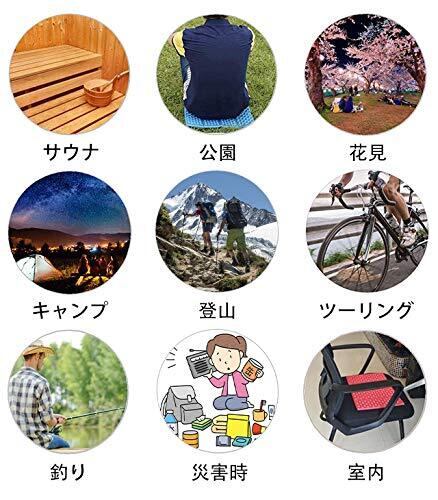 ・用途:サウナ、公園、花見、キャンプ、登山、ツーリング、釣り、災害時、室内など