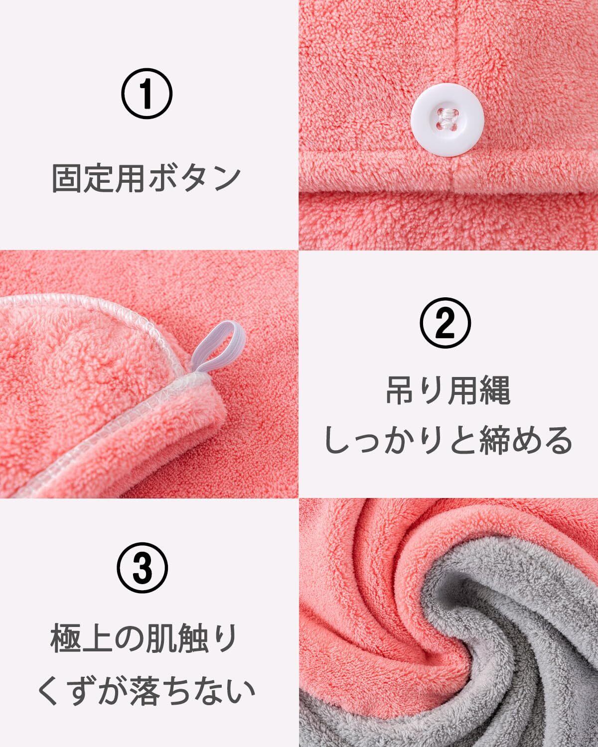 【特別なデザイン】ドライキャップがボタン付きなので、髪を包んだまま用事をしても落ちられません。風呂上がりとき、服を濡らすことが心配しないでください。シャワーキャップの構造が人性デザインですが、装着が簡単ですが、2種類があります。後ろ留め 1.髪の毛を包んで前に伸ばす 2.数回ねじって3.後ろでボタンを留めます。 前留め(ショートヘアはこっち)1.後ろで髪を包んで伸ばす 2.数回ねじって 3.前でボタンを留めます。
