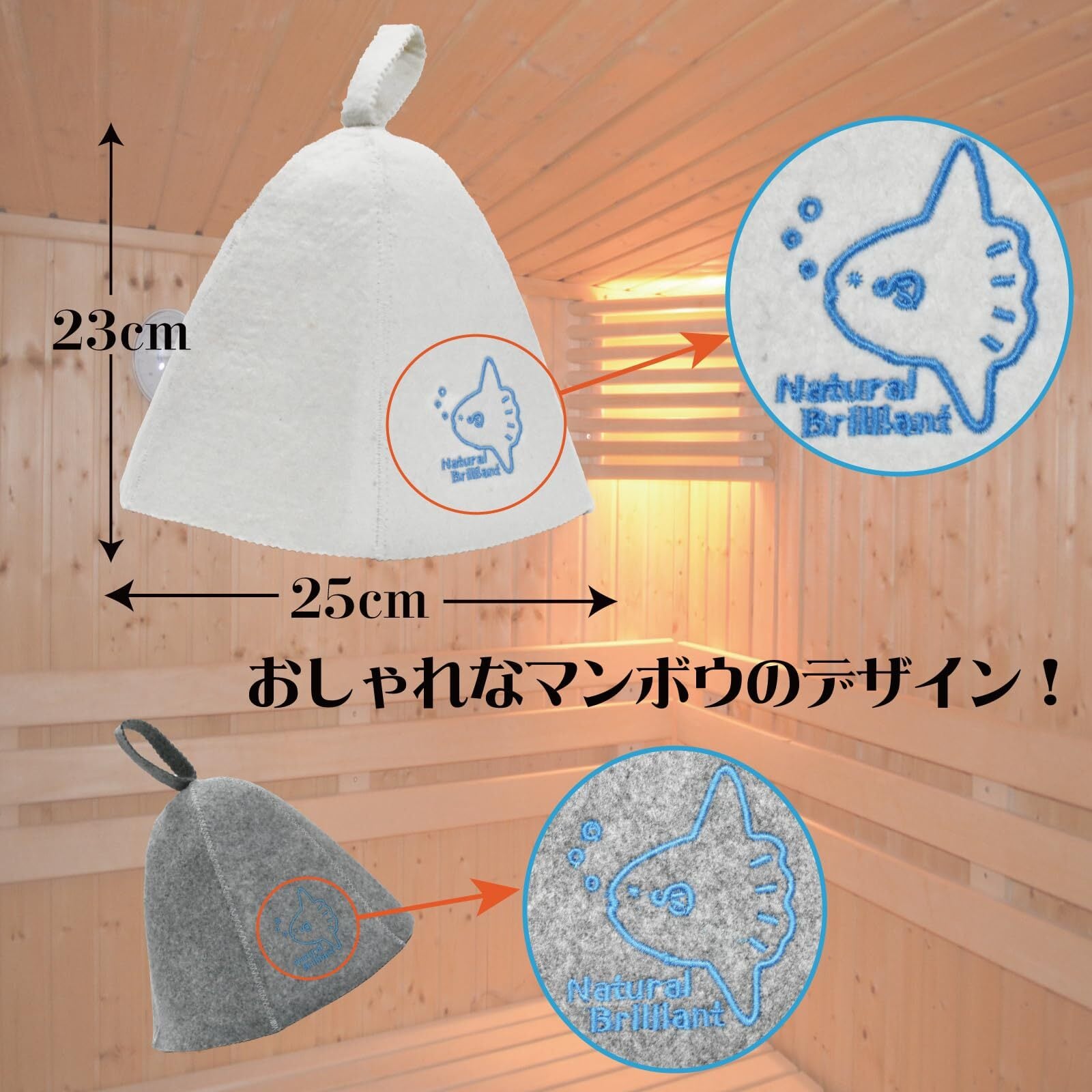 人気のサウナハットが改良されて新登場です!ワンポイントにおしゃれなマンボウの刺繍を施しました。