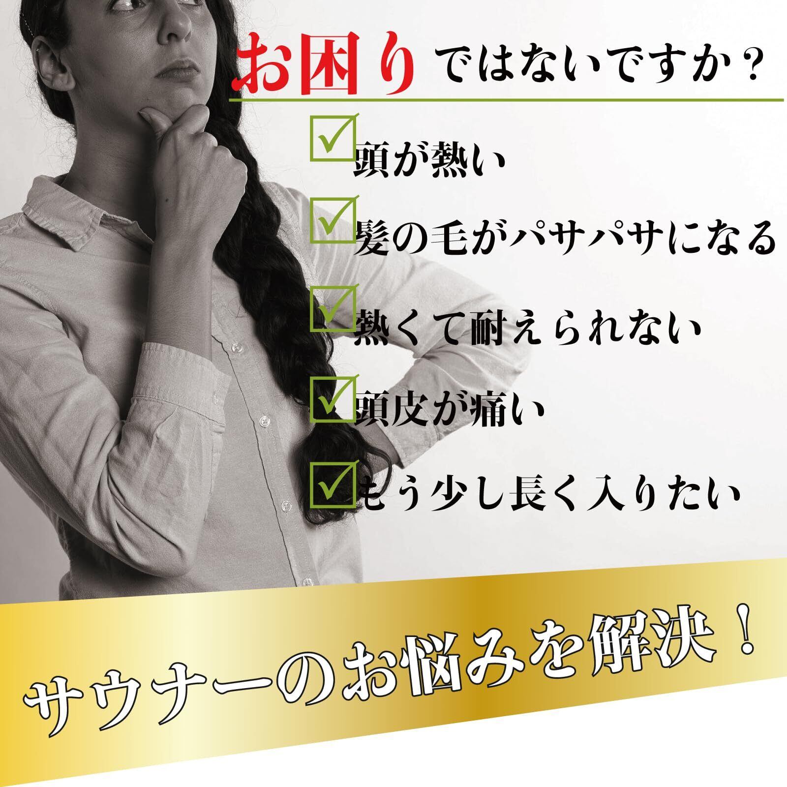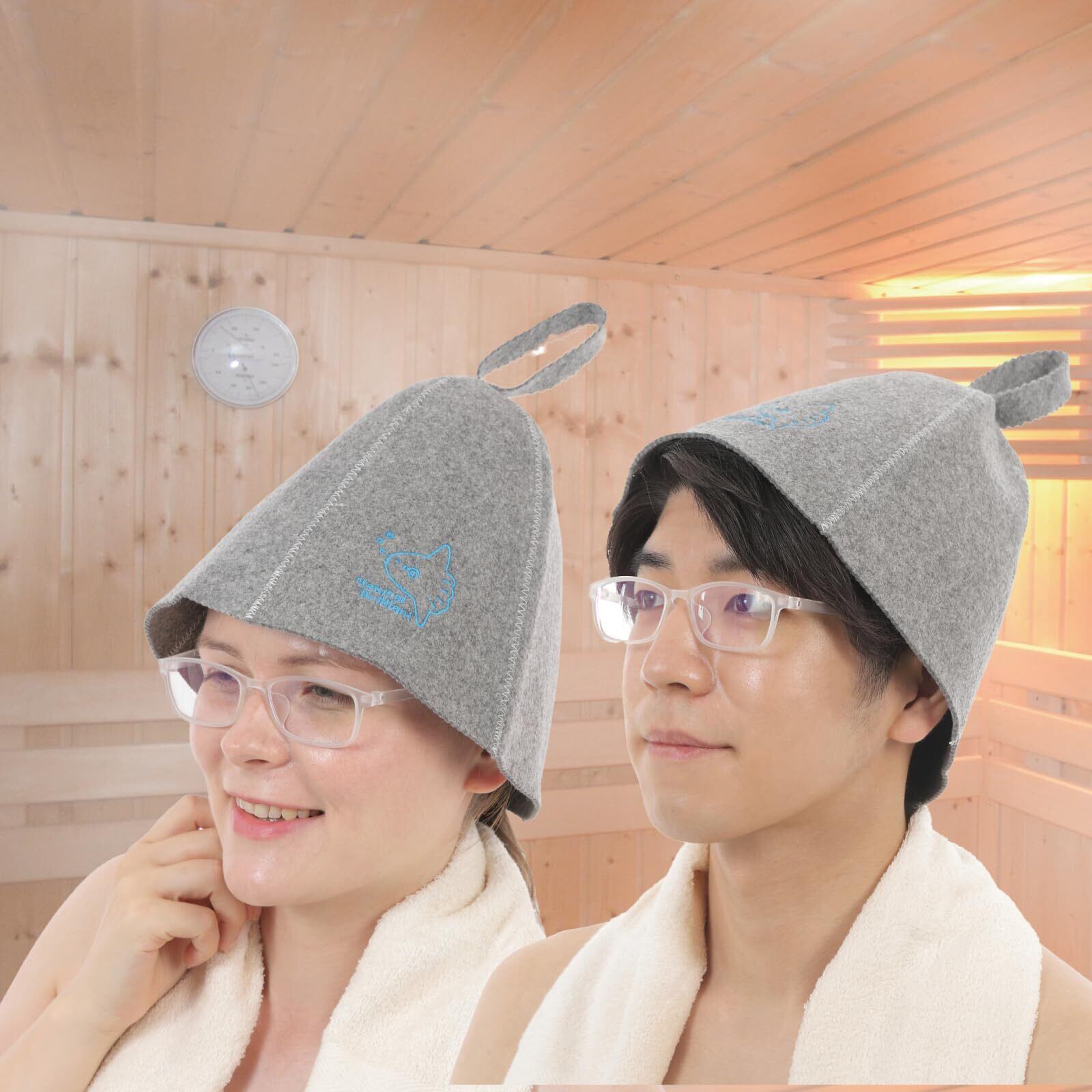 乾燥し、室温も高いサウナ室では髪に含まれる水分がなくなるため、髪質がパサパサに なってしまいますがサウハットをかぶると熱気から髪と頭皮を保護します。