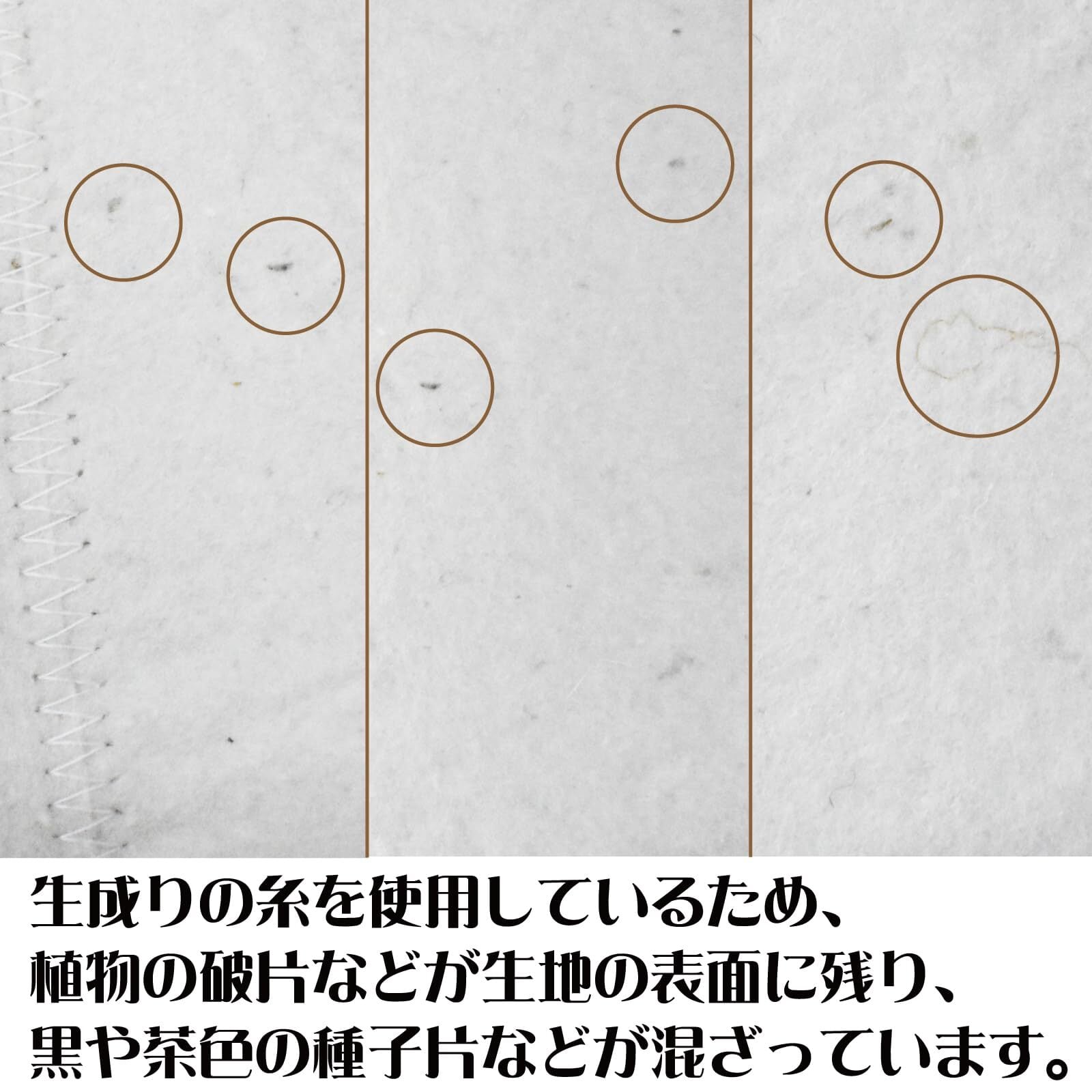 ホワイトは生成りの糸を使用しているため、植物の破片が生地の表面に残り、黒や茶色の種子片などが混ざっています。