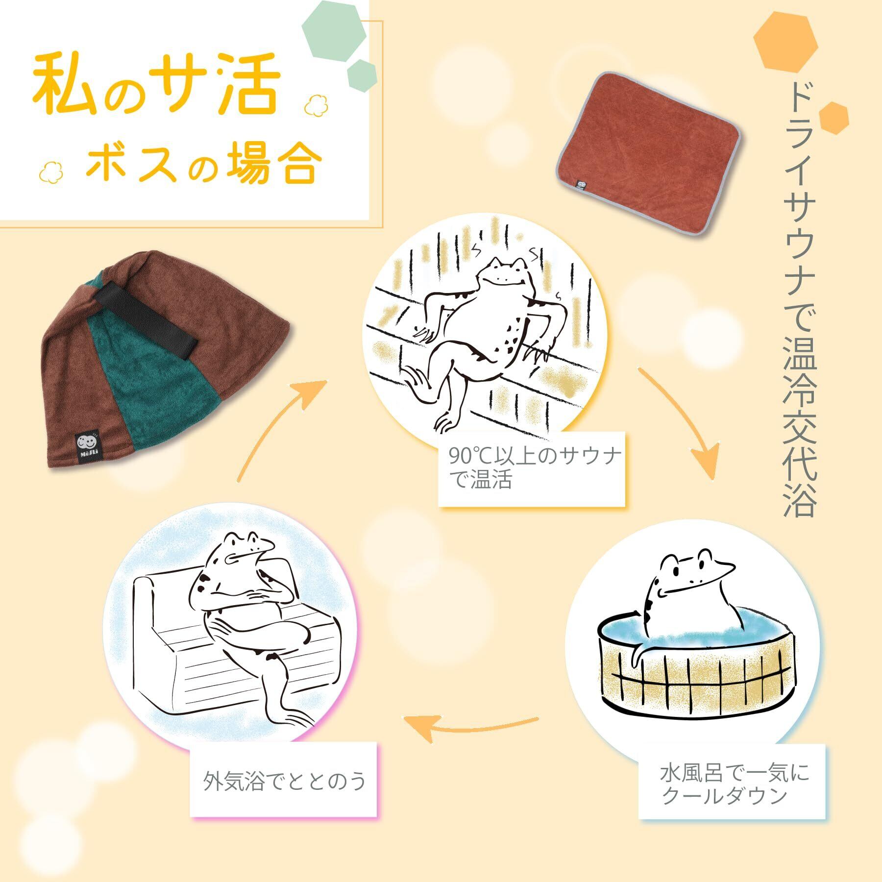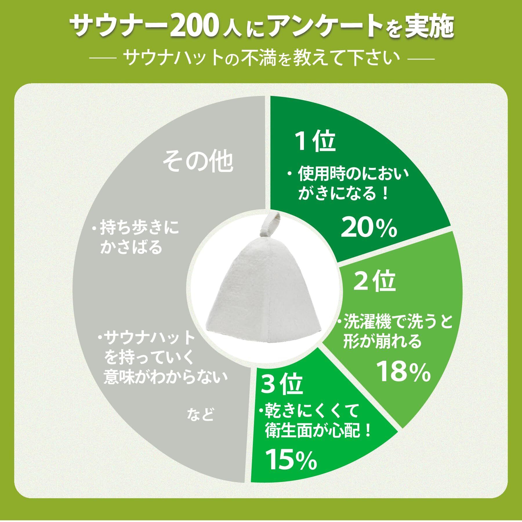 【なぜサウナハットが必要か】 サウナ室内は高温低湿度のため長時間利用すると髪の水分を失いやすく、また、頭や顔に熱気が当たり続けるため、のぼせや目眩の原因にもなります。 サウナハットを被ることにより、髪の痛みやのぼせ、目眩を予防することができます。