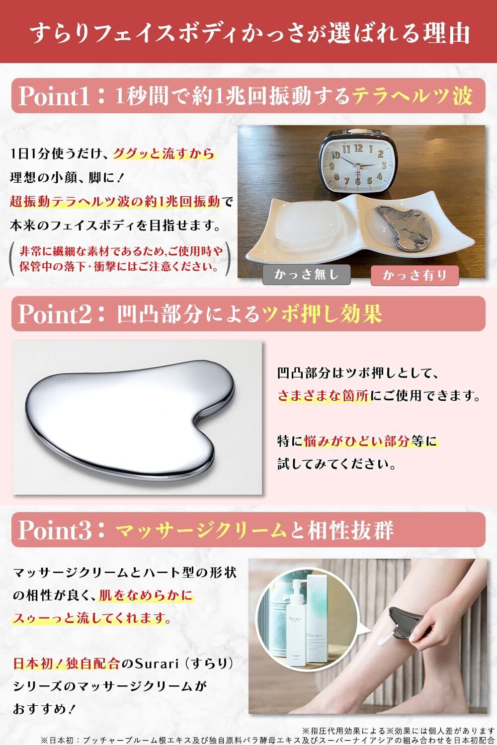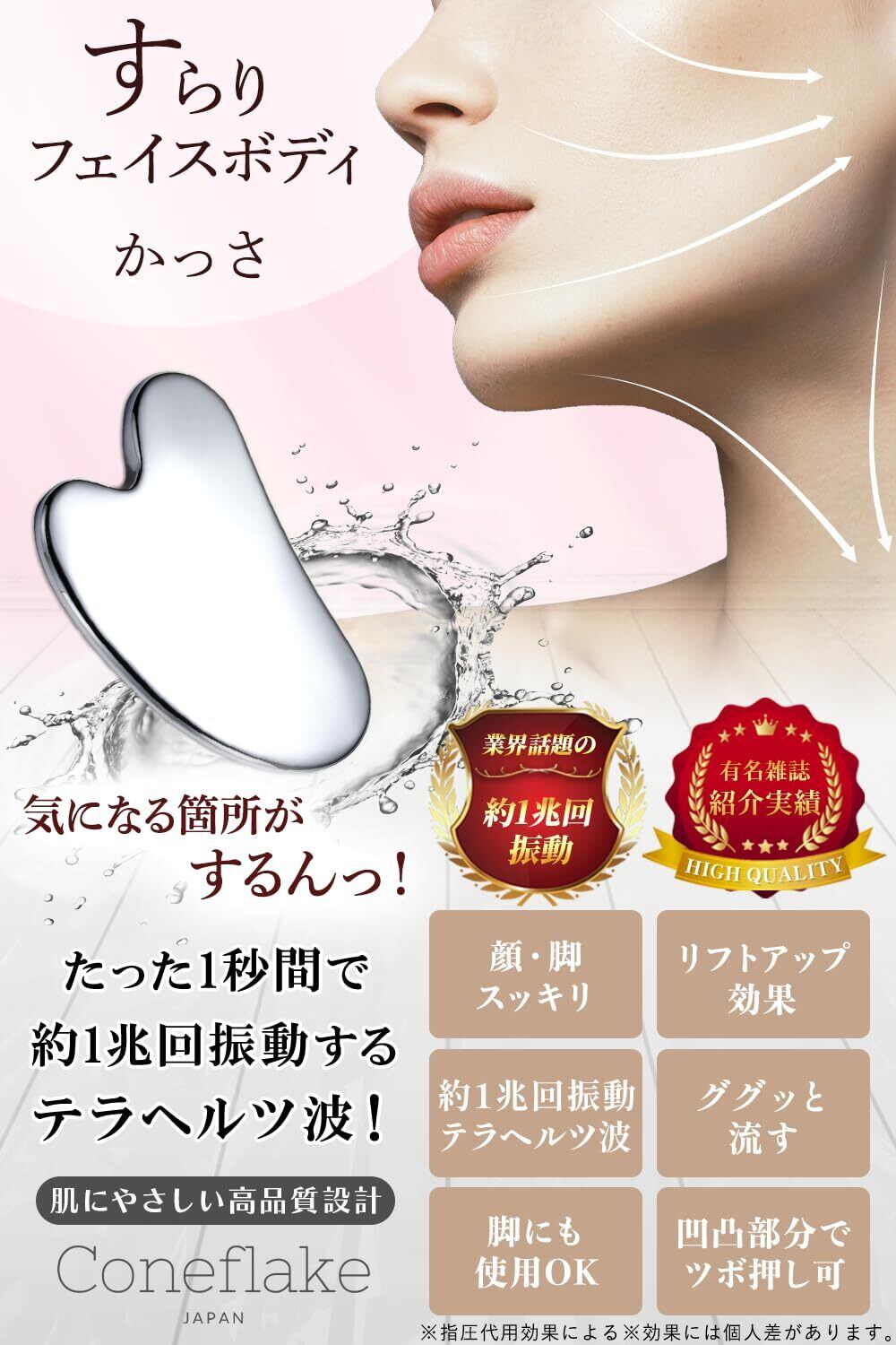 【商品基本仕様】気になる箇所がするんっ!1兆回振動する かっさプレート 。1秒間に約1兆回振動するテラヘルツ波が、気になる箇所にアプローチ。スッキリとした顔・脚になる効果が期待できます。