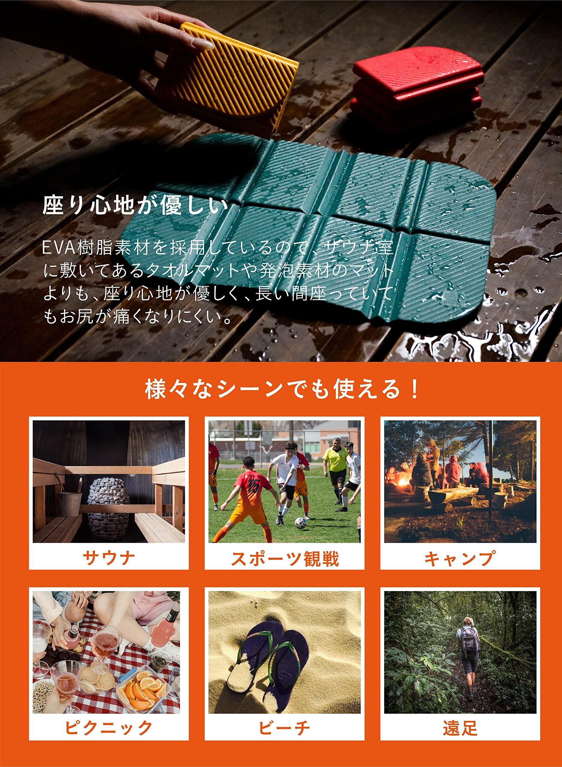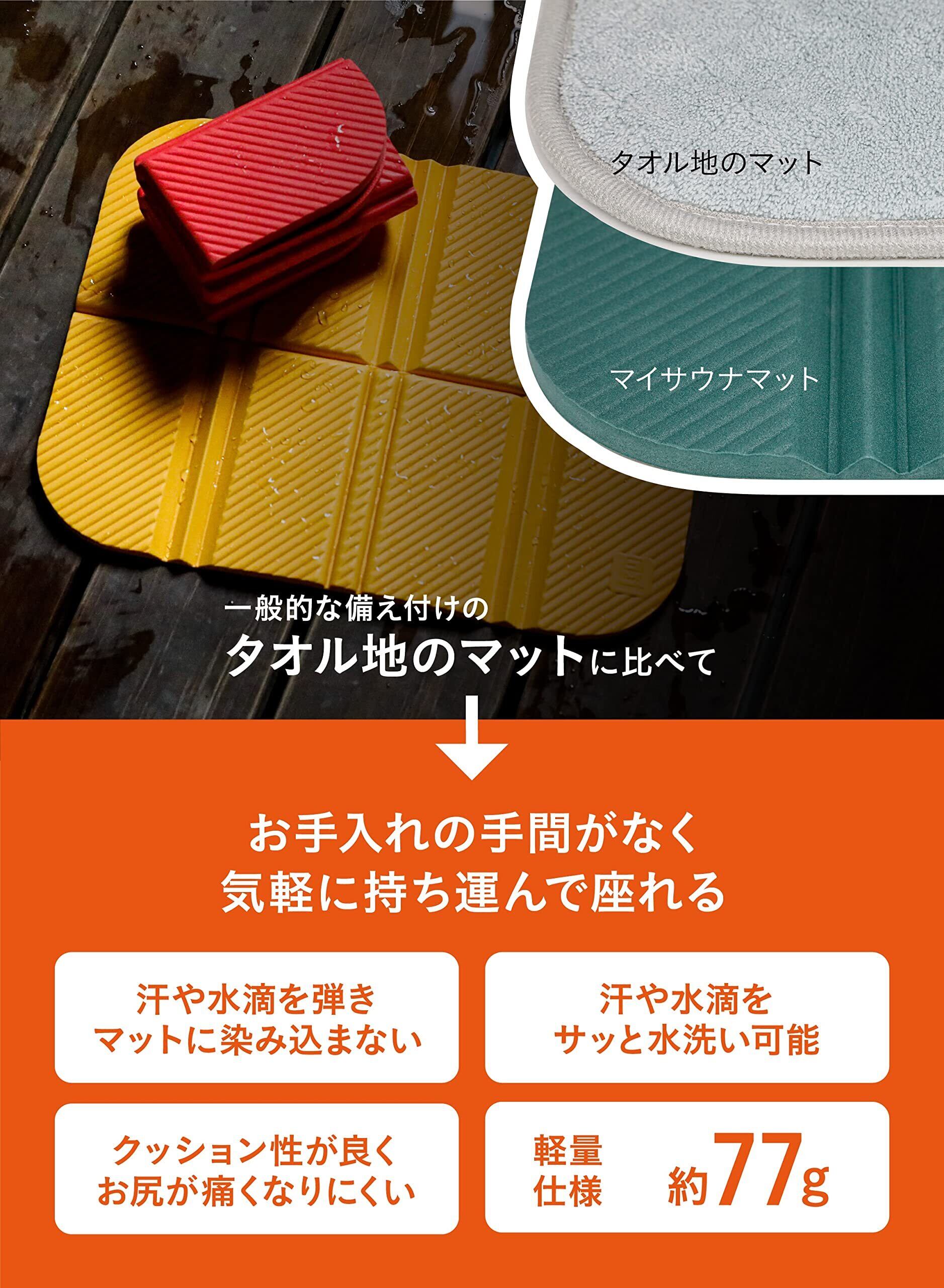 サウナ内はもちろん、外気浴のときには普段座ったらお尻が痛くなってしまう場所(岩肌の段差など)でも、お尻の下に敷いて座れるので、ゆっくりと外気浴が出来ます。