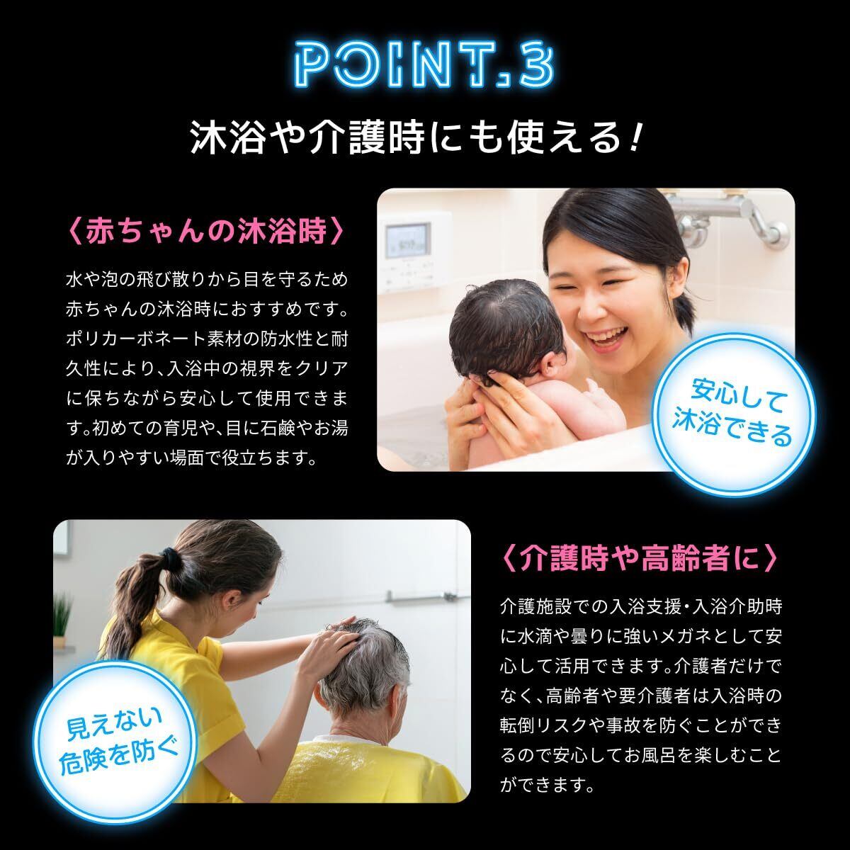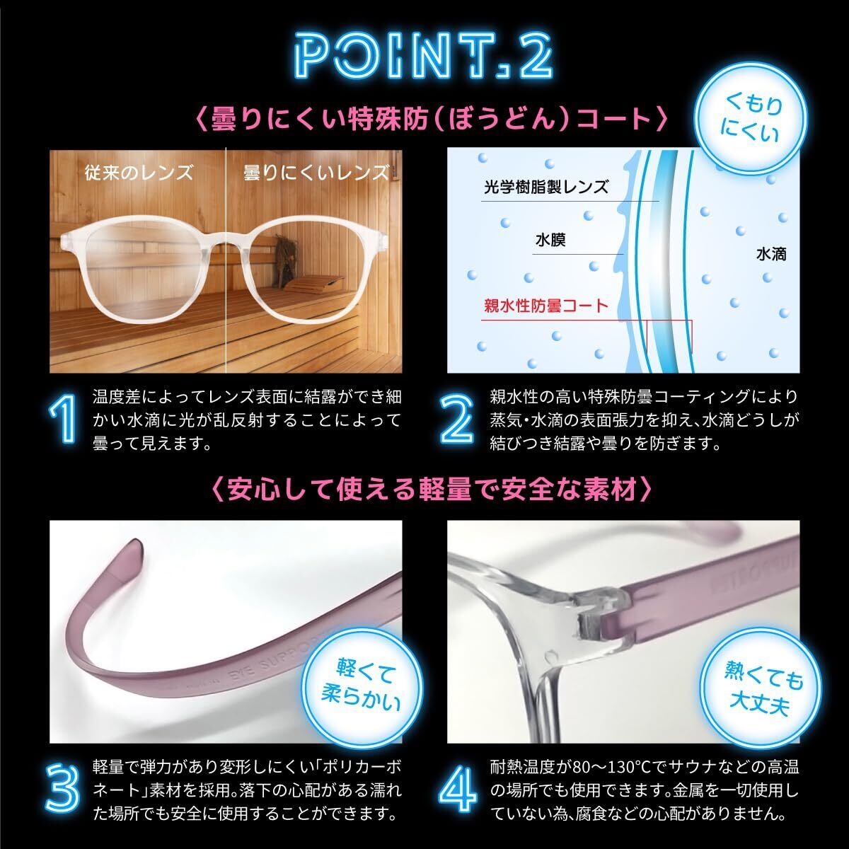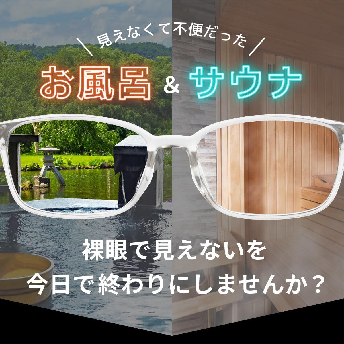 ■濡れてもさびない、曇りにくい、熱にも強い。お風呂・サウナを「安心・安全」に楽しめるように。度入りのレンズで、熱や腐食にも強い。入浴中の見えないを解消。