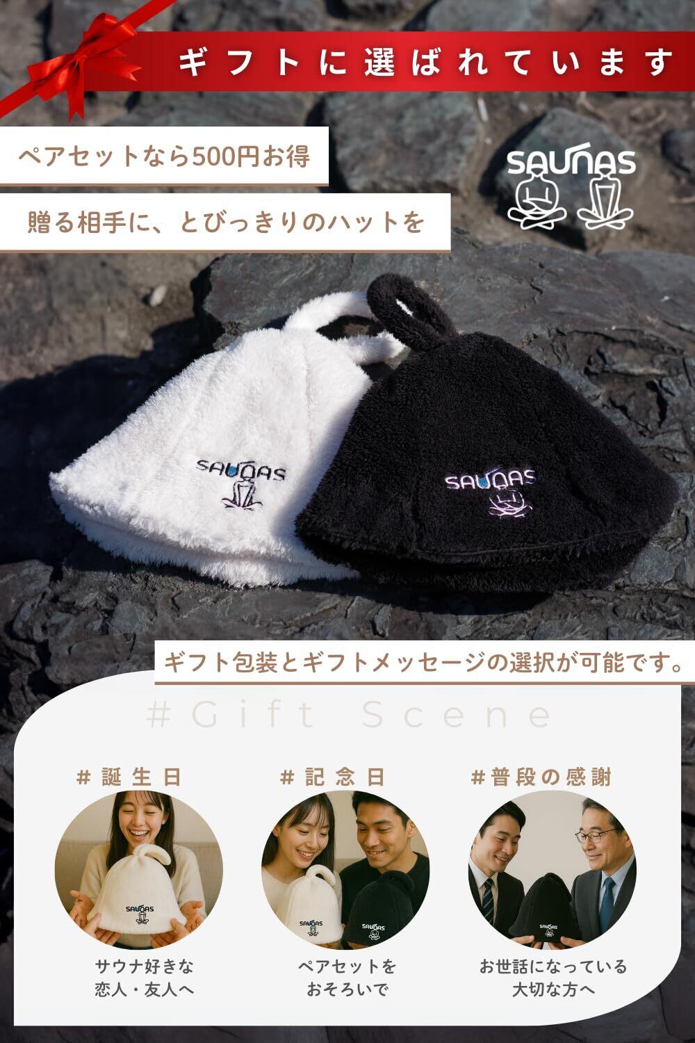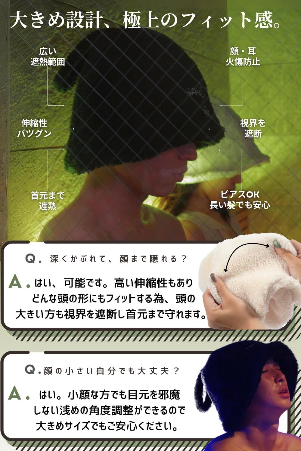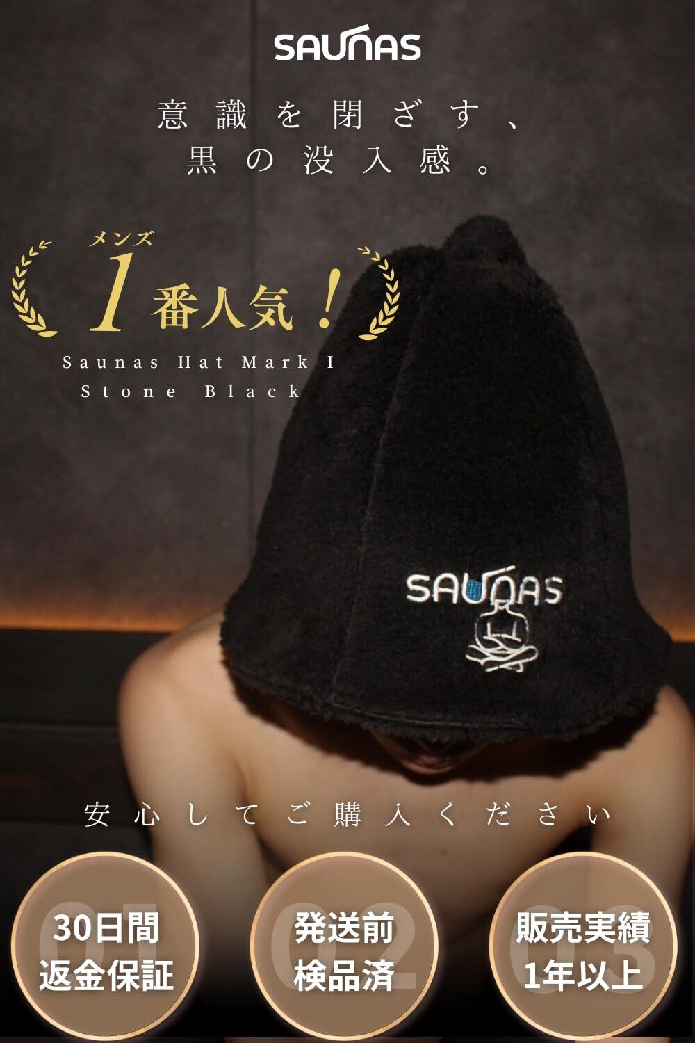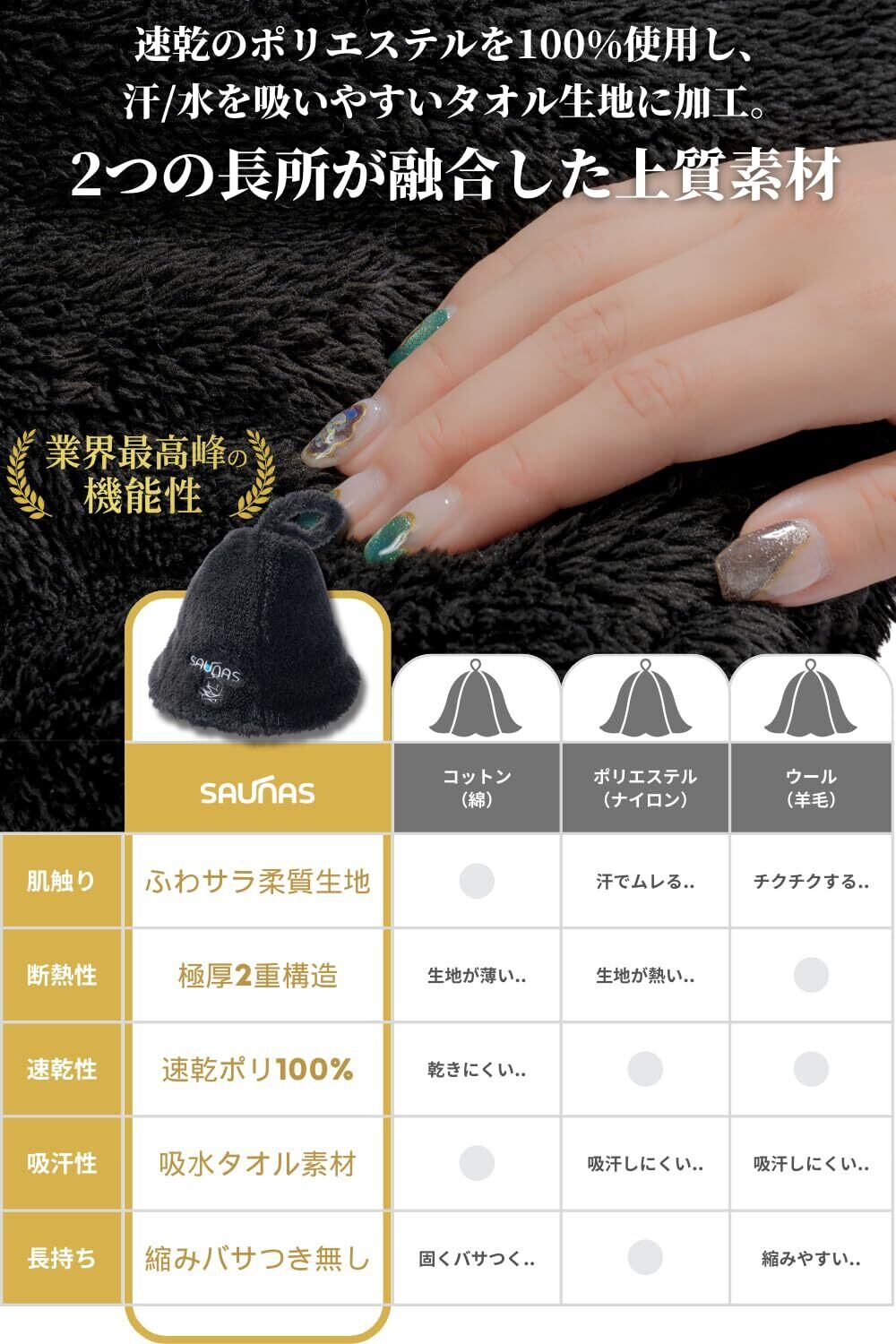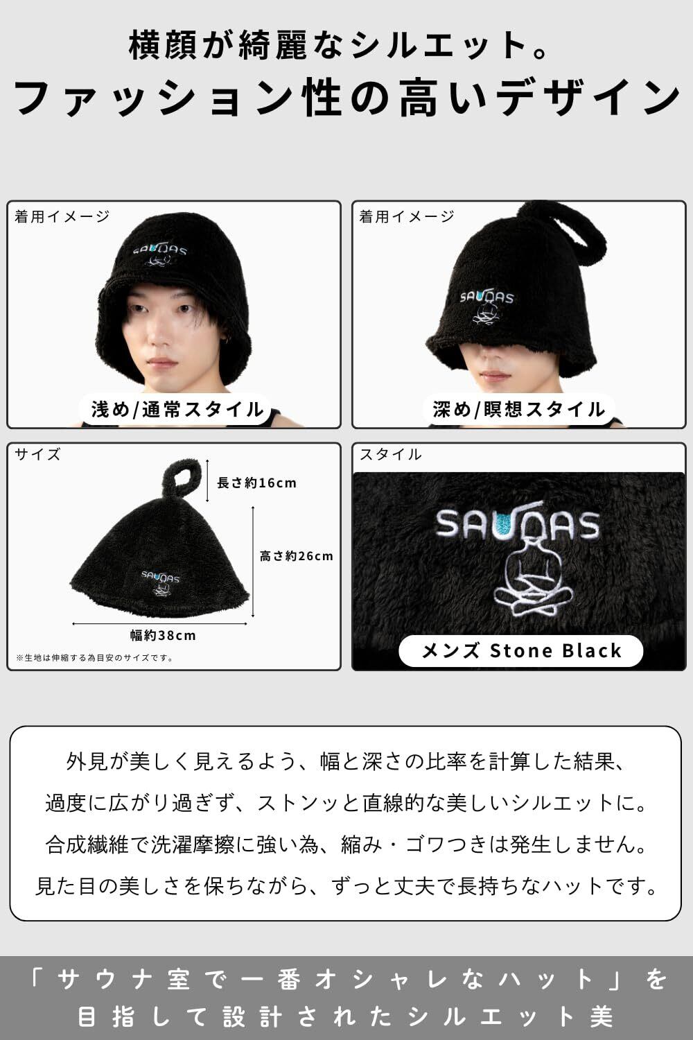 【 サウナハット メンズ ブラック ( 黒 )】 saunas のサウナハットは、 ふわふわ モコモコ の 黒い タオル生地 に付いた かわいい 刺繍が特徴。 お洒落 で 可愛い 黒色 男性用 サウナハットは、サウナ室の灯りをも遮断できる、瞑想サウナキャップです。