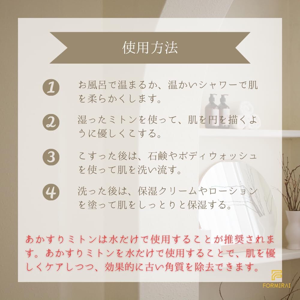 【あかすりミトンの効果的な使用方法】: お風呂に入る前に温水で体を洗浄し、毛穴を開いておきましょう。あかすりミトンを濡らし、適度な圧力をかけて優しく肌を円を描くようにこすります。特に肘、ひざ、かかとなどの荒れやすい部分を重点的にケアします。 顔の場合は、あかすりミトンを顔に使う際には非常に優しく、敏感な肌を守るために注意が必要です。あかすりミトンでのケアが終わったら、優しい石鹸やボディウォッシュを使って残った古い角質や汚れを洗い流します。 あかすりミトンを使用した後、保湿クリームを肌に塗布して、うるおいを与えます。特に乾燥が気になる部分に重点的にクリームを塗布します。