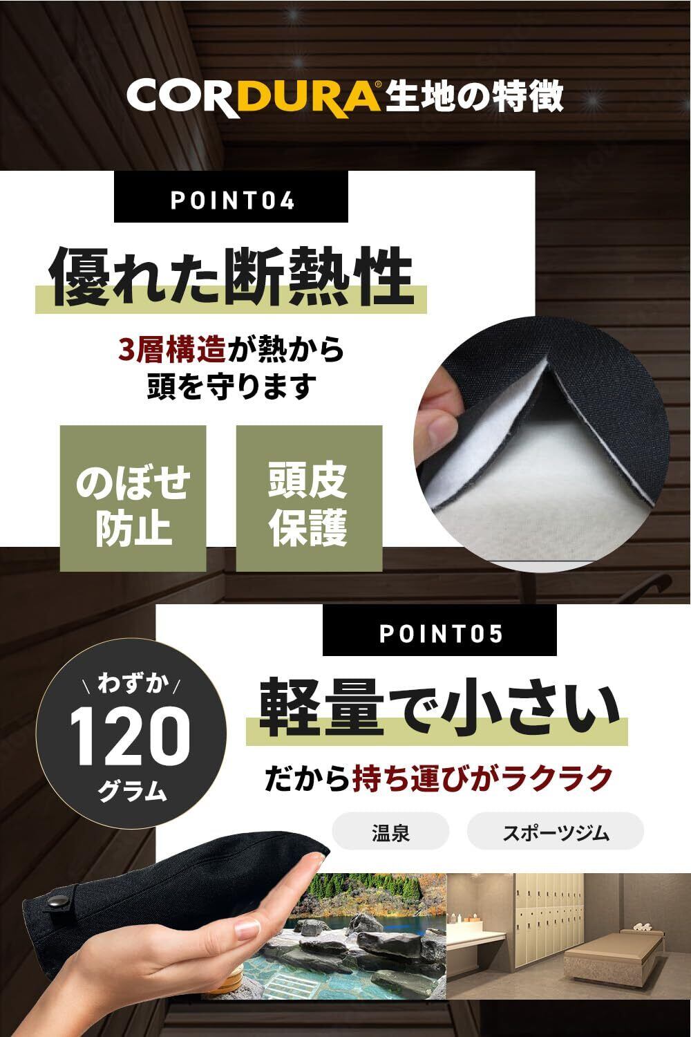 【CORDURA素材の軽量・高機能サウナハットが新登場!】 高機能衣服やワークウェア、高級バッグなどの分野で高く評価されているアメリカのインビスタ社が開発したCORDURA(コーデュラ)素材を使用したサウナハットです。軽量で撥水性、耐久性に優れたCORDURA生地をサウナハットに取り入れ、従来にはない革新的なサウナハットの登場です!サウナハットを頭に被ることで、サウナ内の高温の蒸気から頭部を保護し、髪のパサつき、頭皮の乾燥、のぼせを軽減します。サウナライフに欠かせないサウナグッズです。