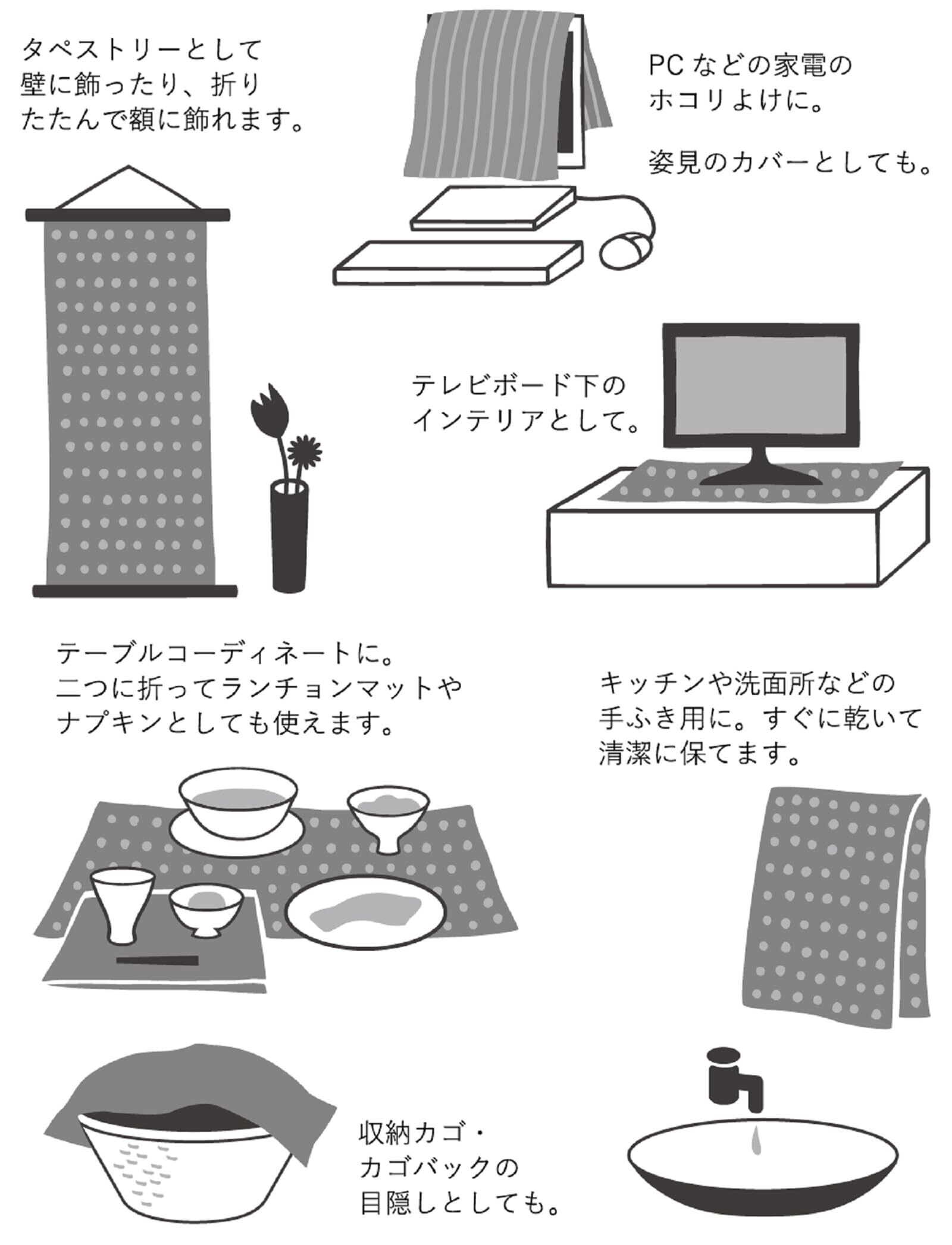 ●普段使いには、アイロンのあて布として使ったり、スカーフ代わりに首元を温めたり、赤ちゃんのスタイ代わりに使ったり。
