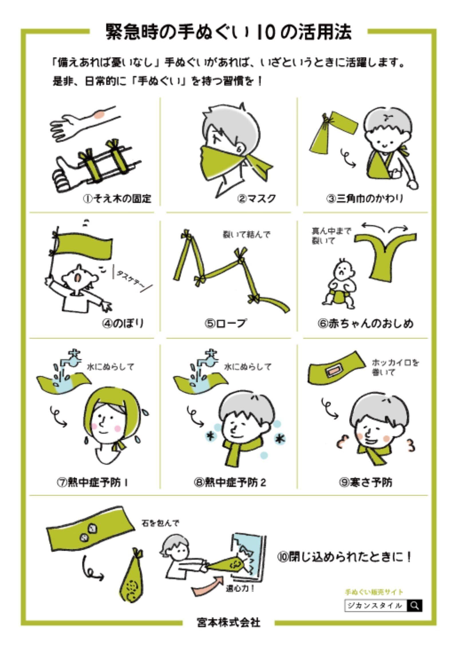 ●レジャーや登山中などにケガをしたときにも、手ぬぐいがあれば出血したところの止血などの応急処置にもお使いいただけます。