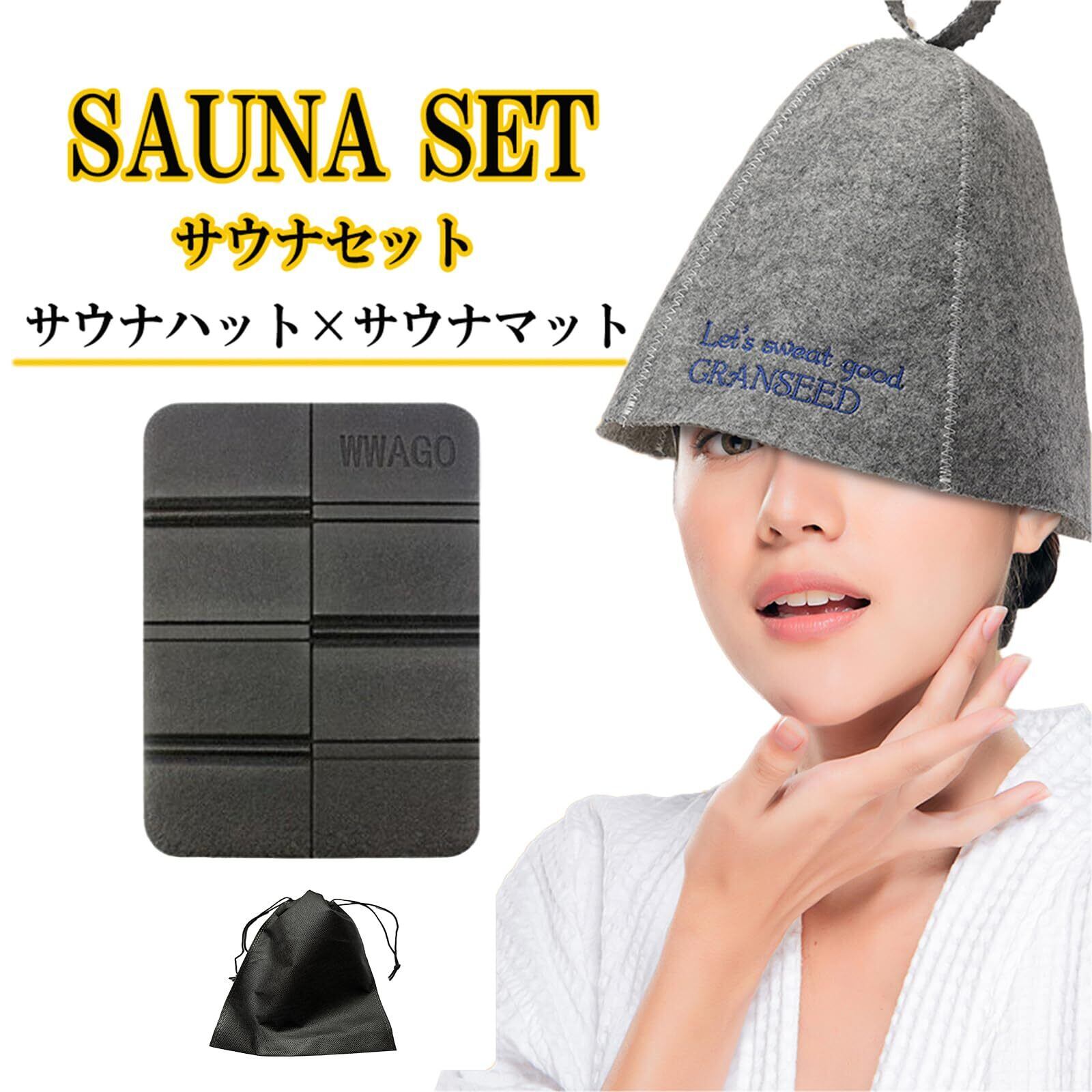 【在庫処分】[GRANSEED] サウナハット サウナマット 2点セット 巾着袋付き 帽子 マット グッズ 洗える 整う メンズ レディース フリーサイズ 髪の毛 頭皮 保護 乾燥防止 | paghag