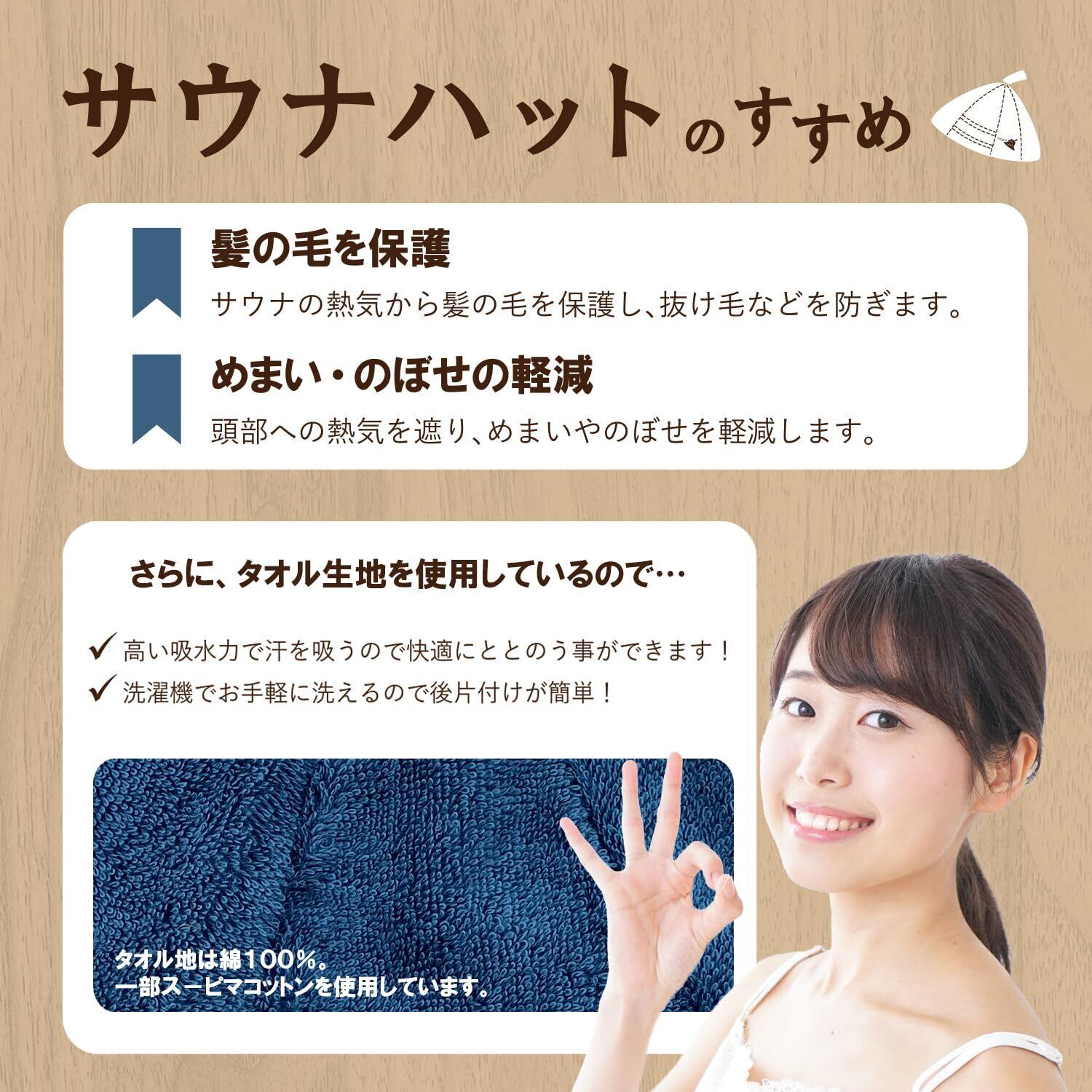 【サ活をより健康的に】サウナハットは、サウナの本場フィンランドでもポピュラーなアイテムです。そんなサウナのマストアイテムを綿100%のタオル生地でつくりました。●サウナの熱気や湿度から髪の毛を保護し、抜け毛などのダメージを防ぎます。●頭部への熱気を遮り、めまいやのぼせを軽減します。