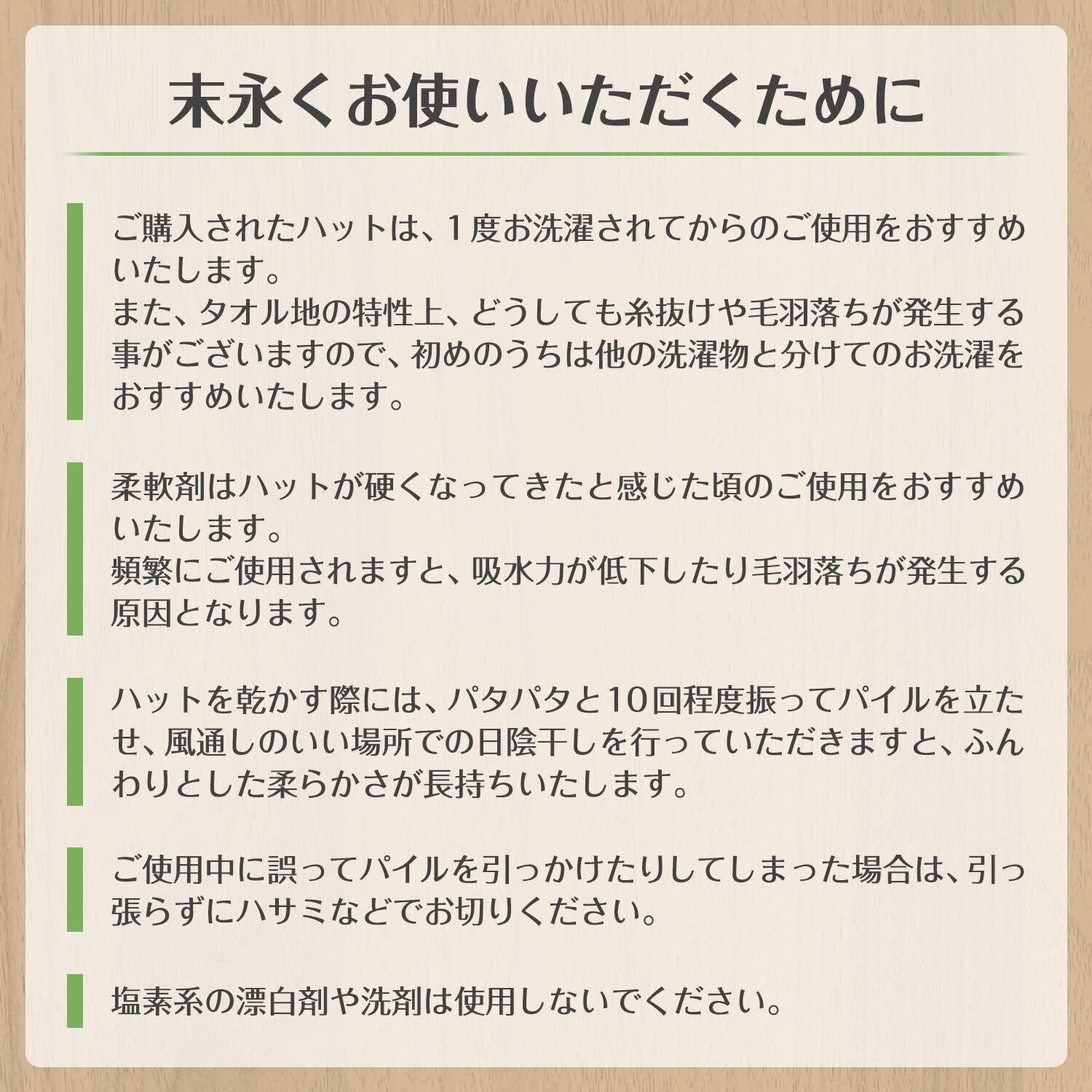 【ご使用の際のお願い】■綿製品の特性上、毛羽落ちがございます。■一度お洗濯してからのご使用をおすすめいたします。■柔軟剤の過度な使用は毛羽落ちや吸水性の低下につながりますので、タオルが硬くなってきたと感じた頃のご使用をおすすめいたします。■塩素系漂白剤や塩素系洗剤のご使用は色落ちや変色してしまいますのでお控えください。