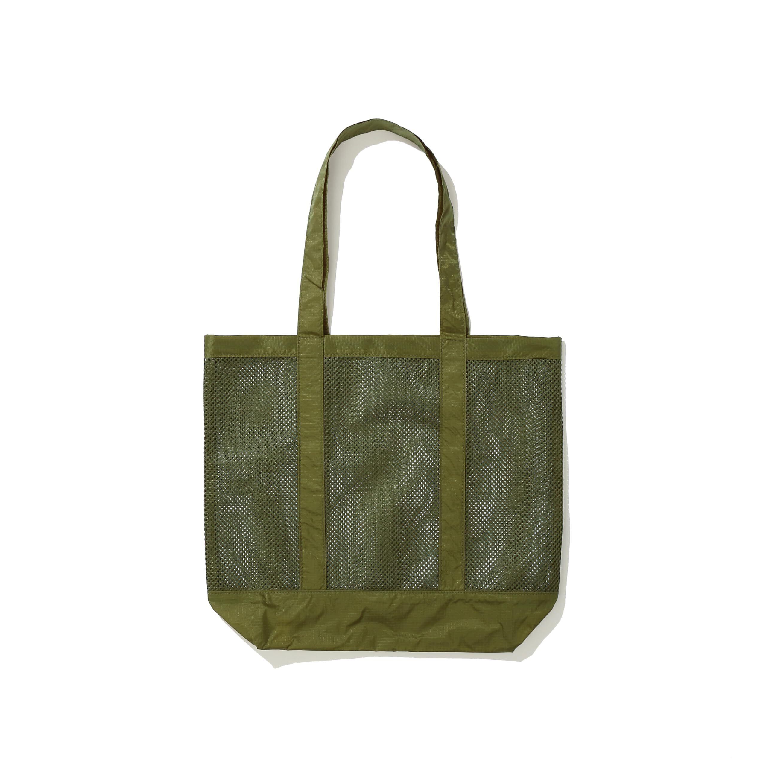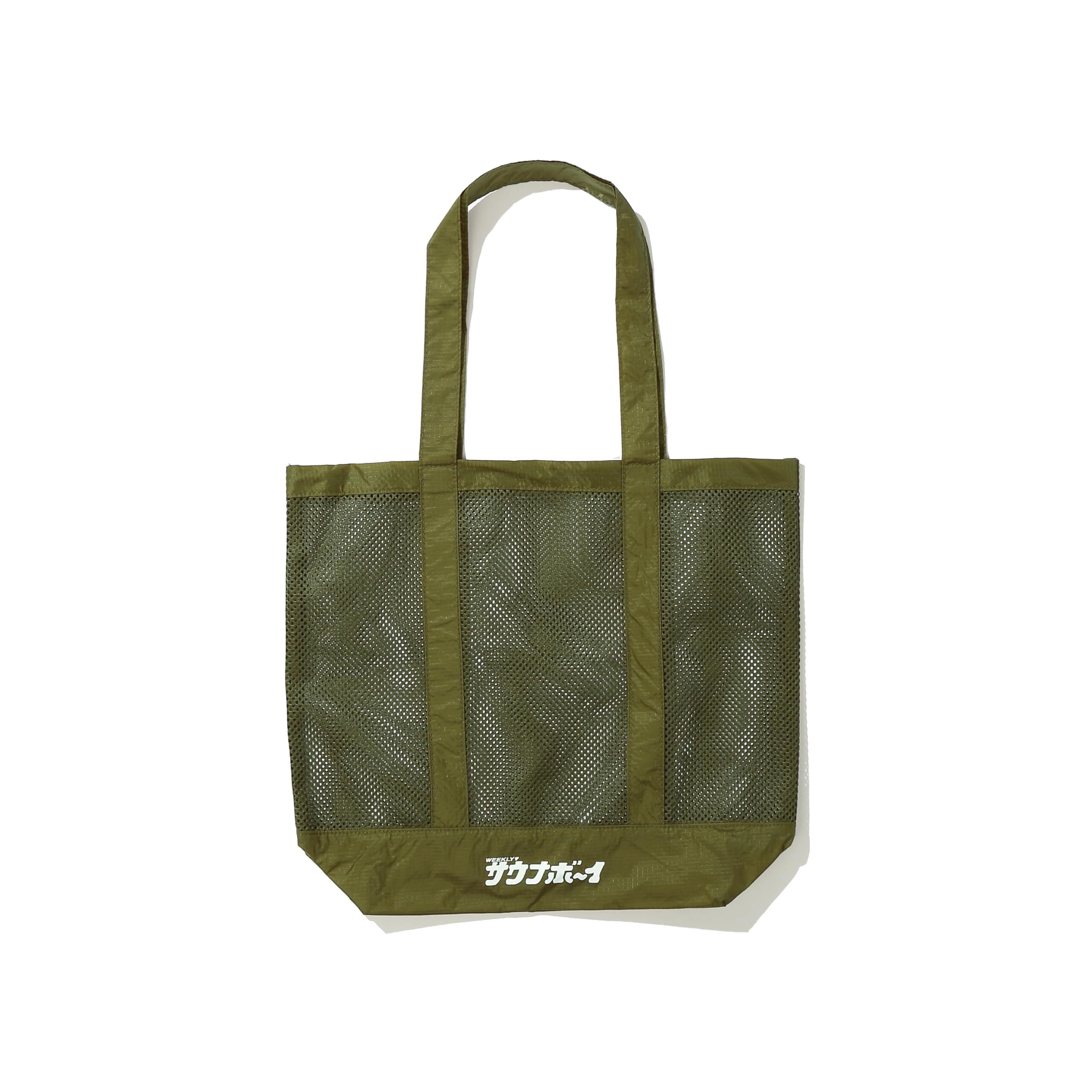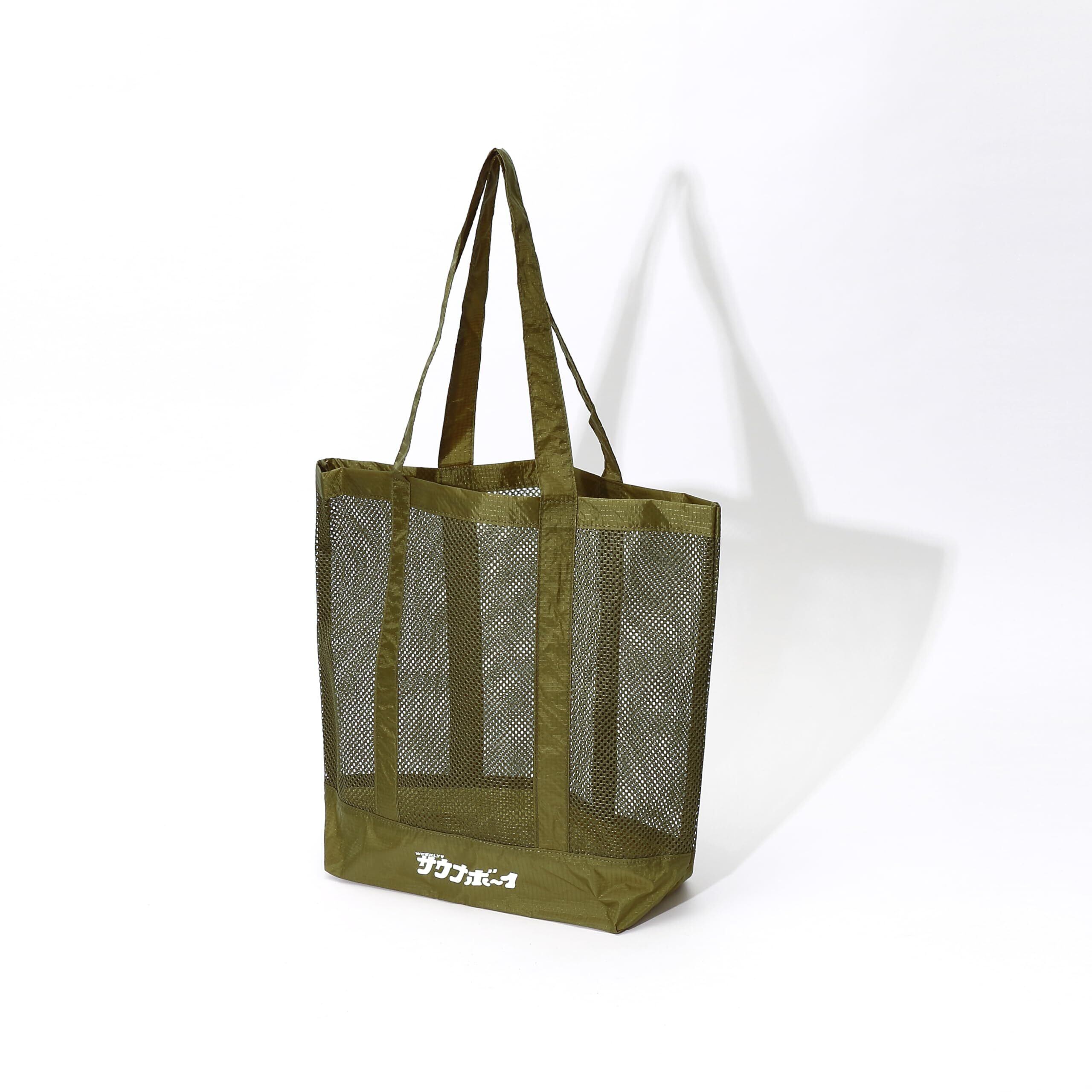 スーパー銭湯の館内バッグをモチーフに街でも使えるようにアップデートしたメッシュ素材のトートバッグ。 素材:ポリエステル カラー:BLACK、KHAKI、GRAY サイズ:幅38cm × 高さ36cm × 底マチ13cm 持ち手:57cm