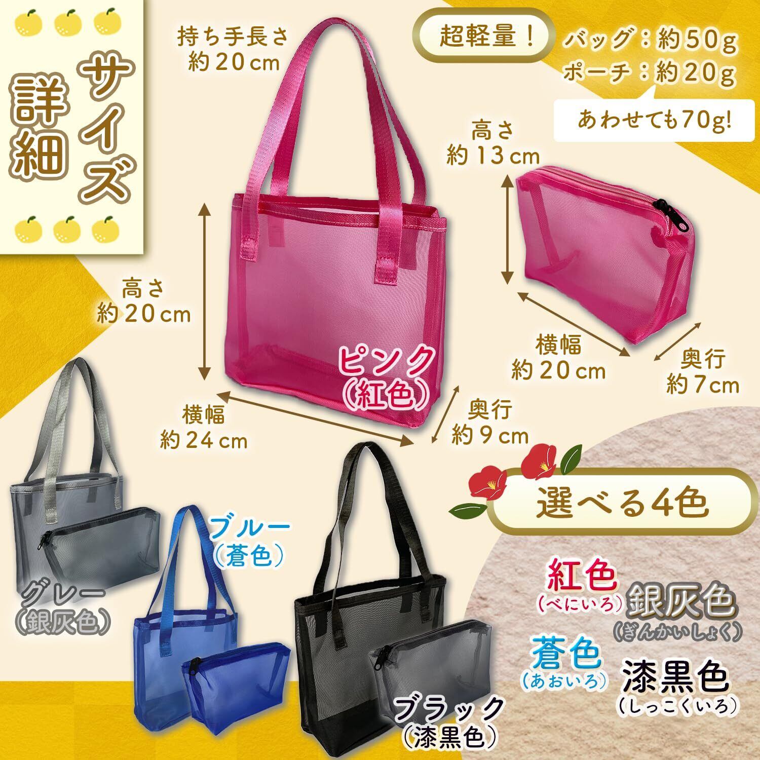 バッグサイズ:横24cm、高さ20cm、奥行9cm。ポーチサイズ:横20cm、高さ13cm、奥行7cm。