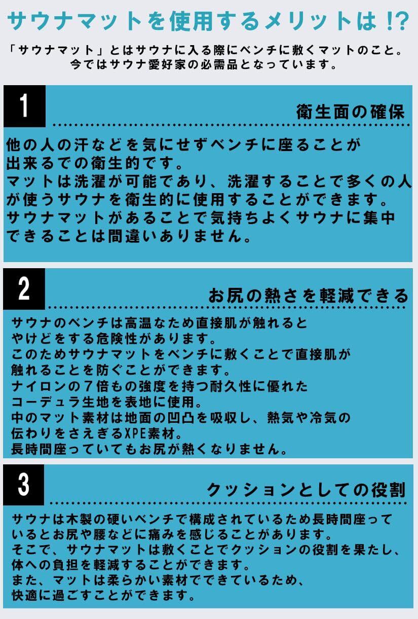 【衛生面の確保】 他の人の汗などを気にせずベンチに座ることが 出来るでの衛生的です。 マットは洗濯が可能であり、洗濯することで多くの人 が使うサウナを衛生的に使用することができます。 サウナマットがあることで気持ちよくサウナに集中 できることは間違いありません。