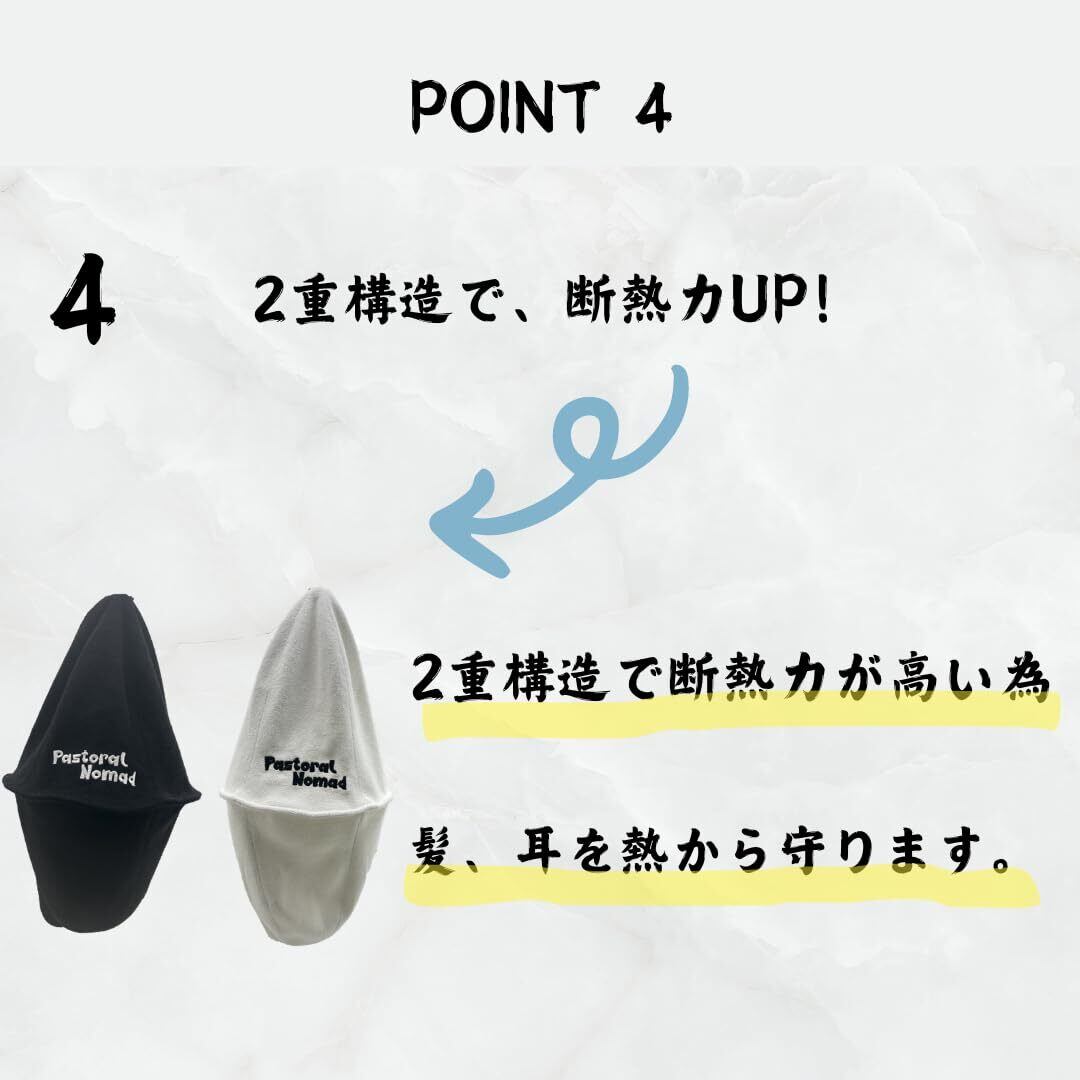 2重構造で断熱力が高いので、髪の毛、耳を熱から守ります。