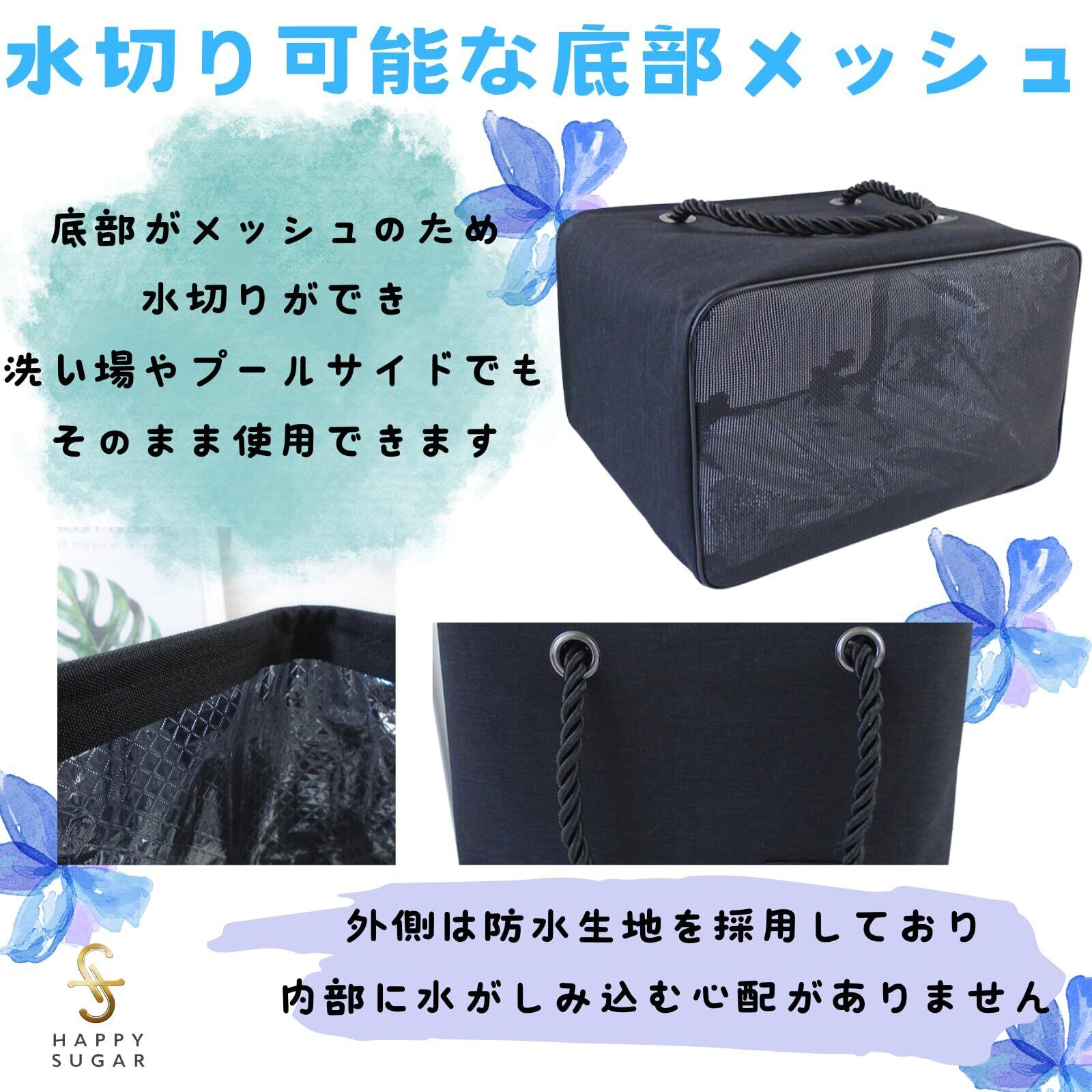 【水切り可能な底部メッシュと防水性能】底部がメッシュになっているため、水切りができ、洗い場やプールサイドでもそのまま使用できます。さらに外側は防水生地を採用しており、内部に水がしみ込む心配がありません。耐摩耗性もあり、長期間の使用に耐える耐久性が魅力です。