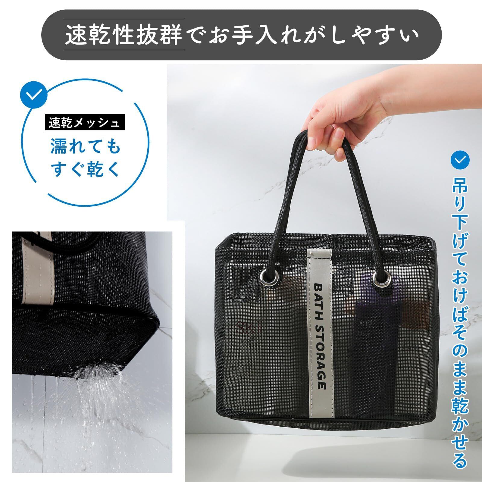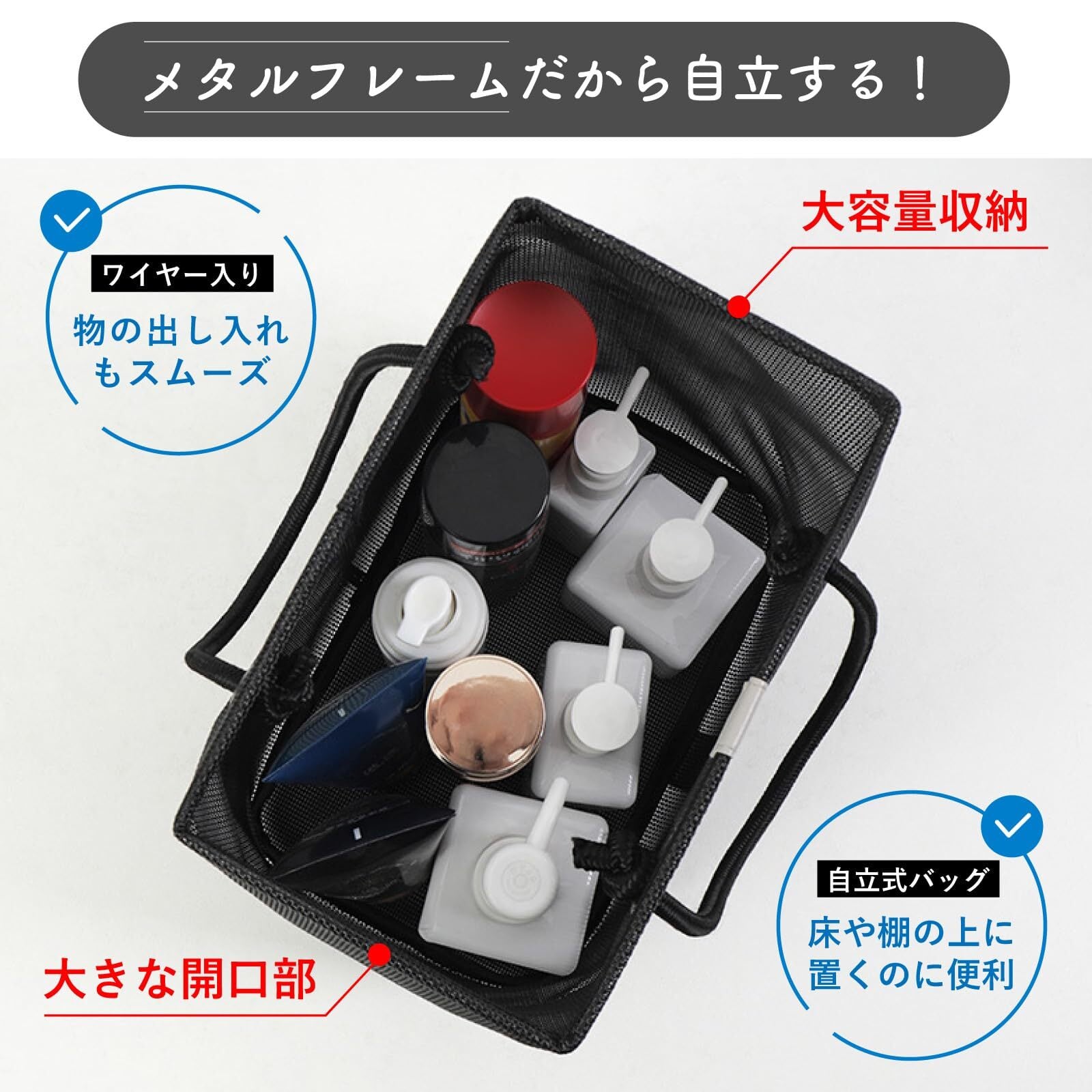 メッシュ手提げは、通気性に優れお手入れもしやすい。濡れたものを入れて吊り下げておけばそのまま乾かせる。小物類、救急用品などの収納も◎。自立式で開口部が広く型崩れしにくいメタルフレームで小物の出し入れもスムーズ。