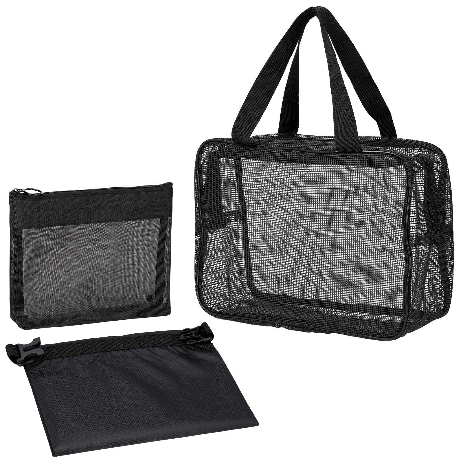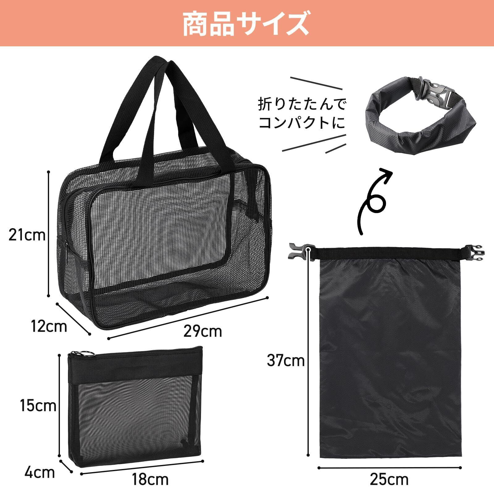 コンパクトなメッシュ素材のバック、ポーチ、濡れた物を収納出来る防水ドライバッグの3点
