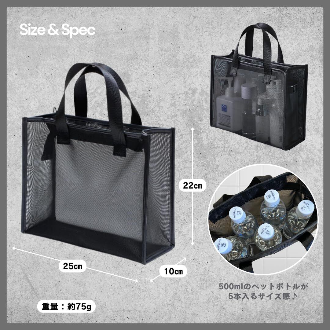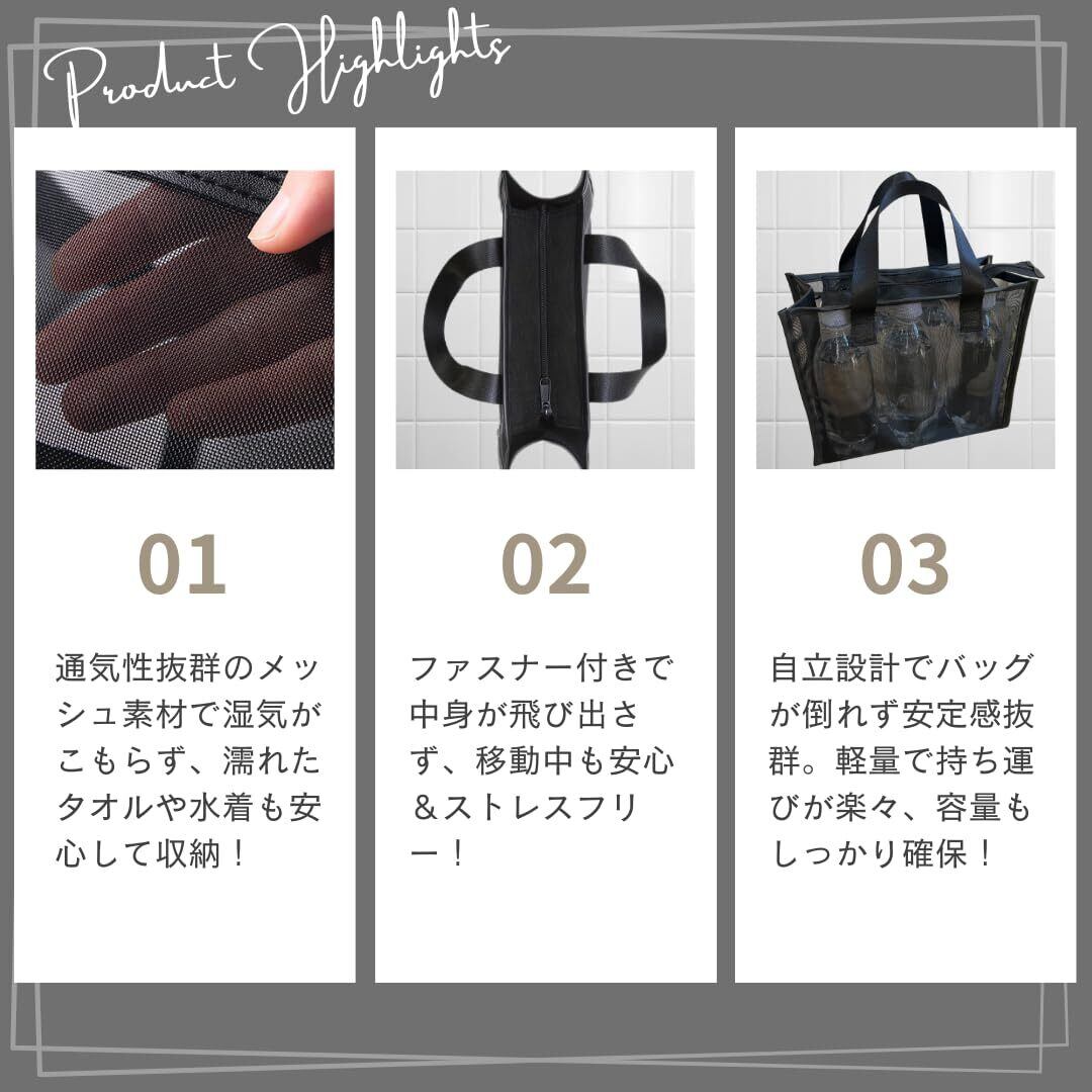 【メッシュ素材で速乾性抜群】 バッグ全体がメッシュ素材で作られており、水や湿気をしっかり逃がします。濡れたアイテムを入れても乾きが早く、嫌なにおいもこもりにくいのが特長です。水回りの使用に最適なデザインです。