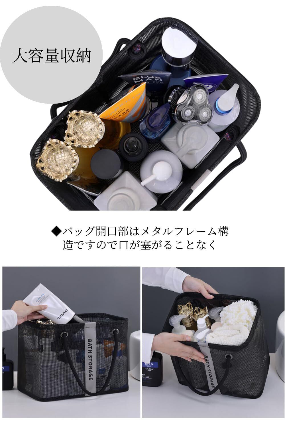【優れた材質】バッグ全体は通気性に優れたメッシュ素材を使用しているため、通気性に優れお手入れもしやすい。濡れたものを入れて吊り下げておけばそのまま乾かせる。