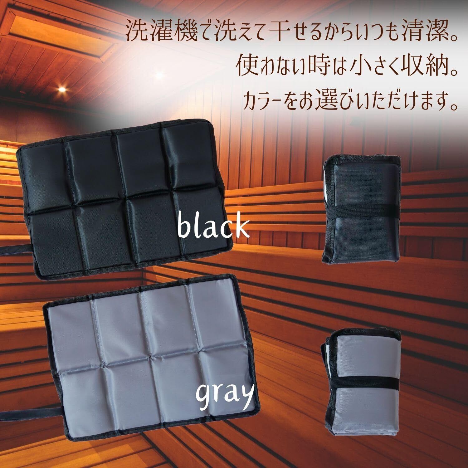 【サウナハット詳細】カラー: navy cacao moka gray サイズ: 深さ22cm 幅31cm 重量48g 素材 :コーラルベルベットポリエステル【サウナマット詳細】カラー: black gray サイズ: 幅40cm 長さ29cm クッション厚み1cm 折りたたみ時 幅10cm 長さ14.5cm 厚み約9cm 重量: 40g 素材: オックスフォード