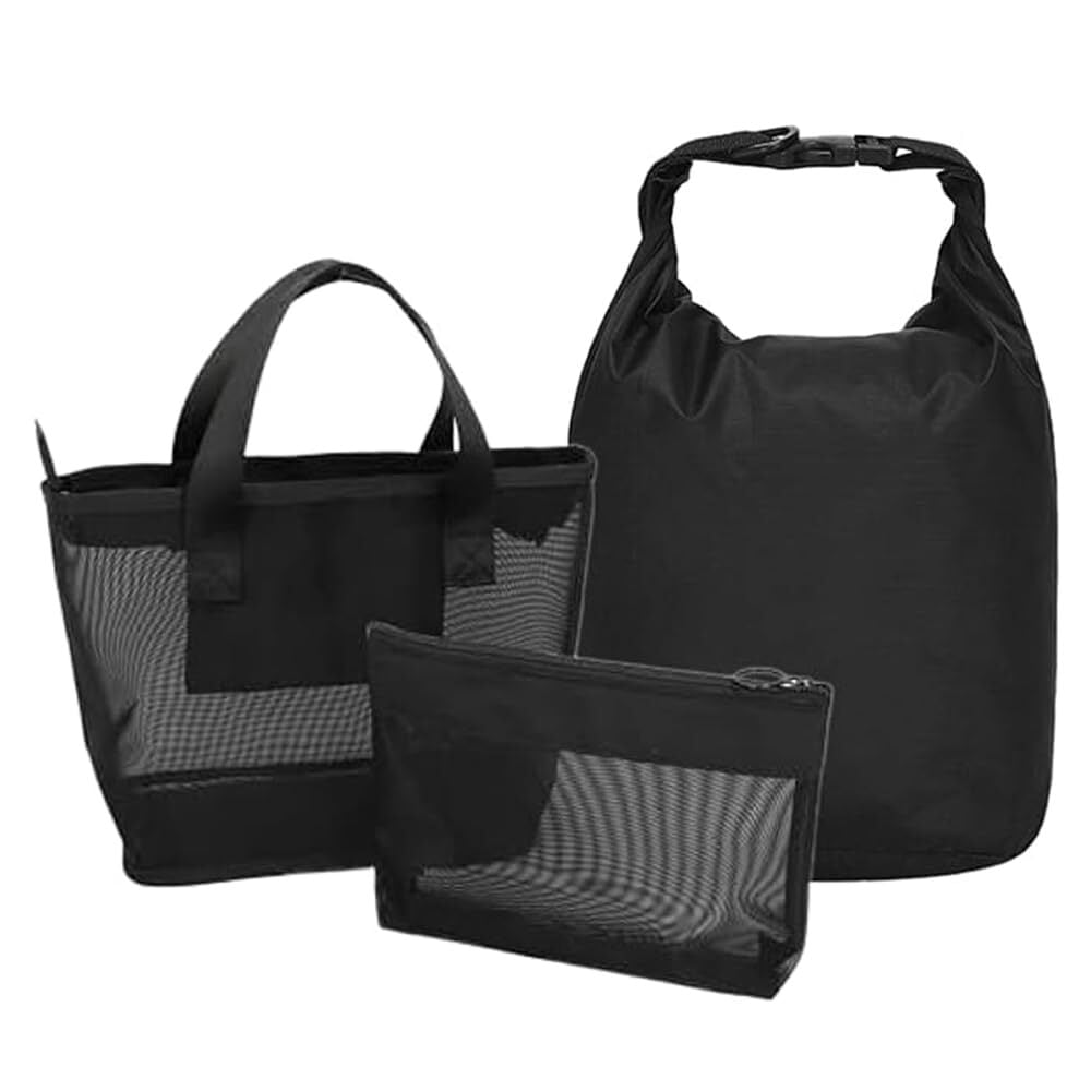 ファスナー付きの内ポケットがついたコンパクトで自立するメッシュトートバッグ&メッシュポーチ・ドライバッグの3点セット。