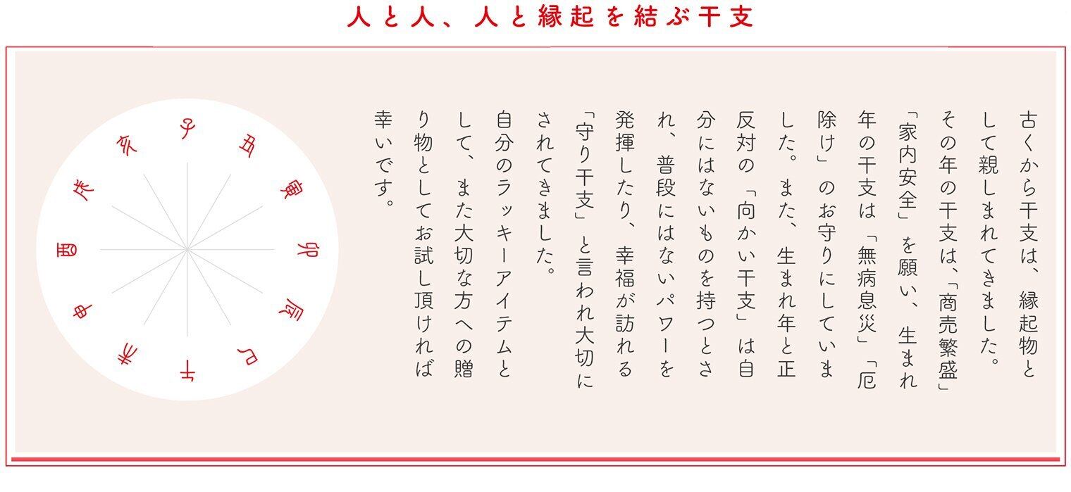 「その年の干支」・・・「商売繁盛」「家内安全」、「生まれ年の干支」・・・「無病息災」「厄除け」、「生まれ年と正反対の干支(向かい干支)」・・・普段にはないパワーを発揮したり幸福が訪れる「守り干支」、など、干支にはさまざまな願いや祈りが込められています。