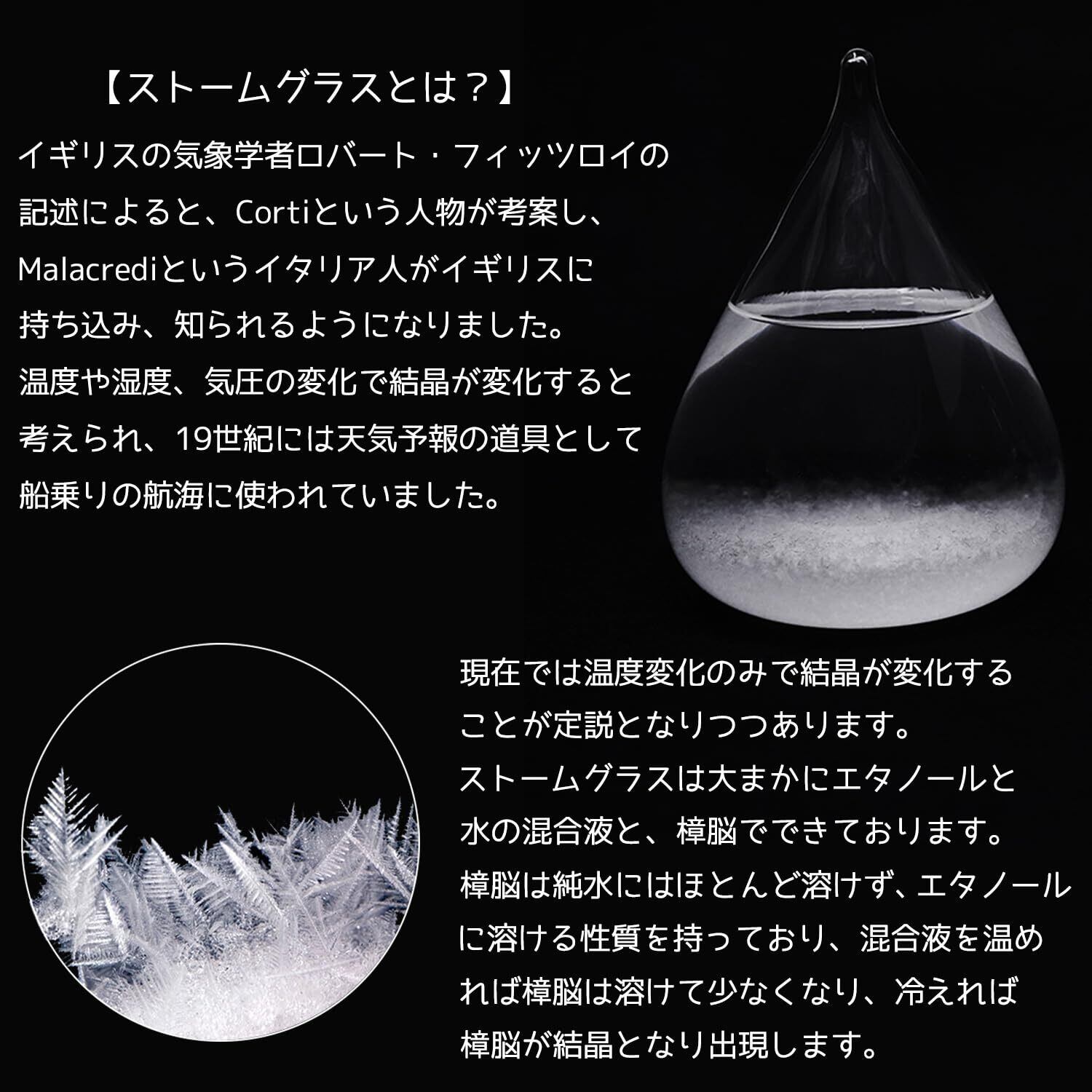 【結晶が変化する理由】結晶が増えたり減ったりする原因。実はまだはっきりわかっておりません。大気の温度や湿度、気圧などの影響によるものと長い間考えられていましたが、現在では温度変化のみで結晶が変化することが定説となりつつあります。ストームグラスは大まかにエタノールと水の混合液と、樟脳でできております。樟脳は純水にはほとんど溶けず、エタノールに溶ける性質を持っており、混合液を温めれば樟脳は溶けて少なくなり、冷えれば樟脳が結晶となり出現します。