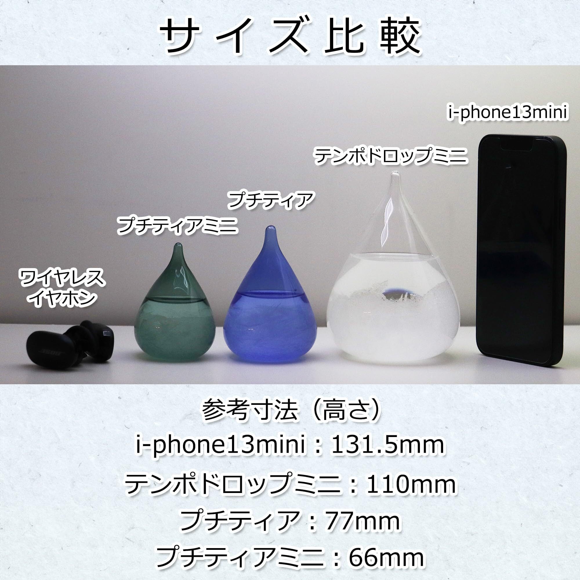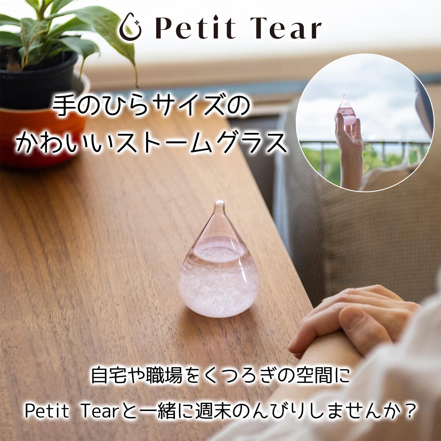 【Petit Tearとは?】Petit Tearは、ストームグラスではほとんど見ないカラーガラスで作られたインテリア雑貨です。元々のベースはストームグラスで有名なテンポドロップミニとなり、今回サイズを手のひらサイズへと小さくし、カラーバリエーションも定番のクリア以外に日本の四季をイメージした和の伝統色の色彩を取り入れております。カラーガラス越しでも結晶はとてもキレイに見ることができます。