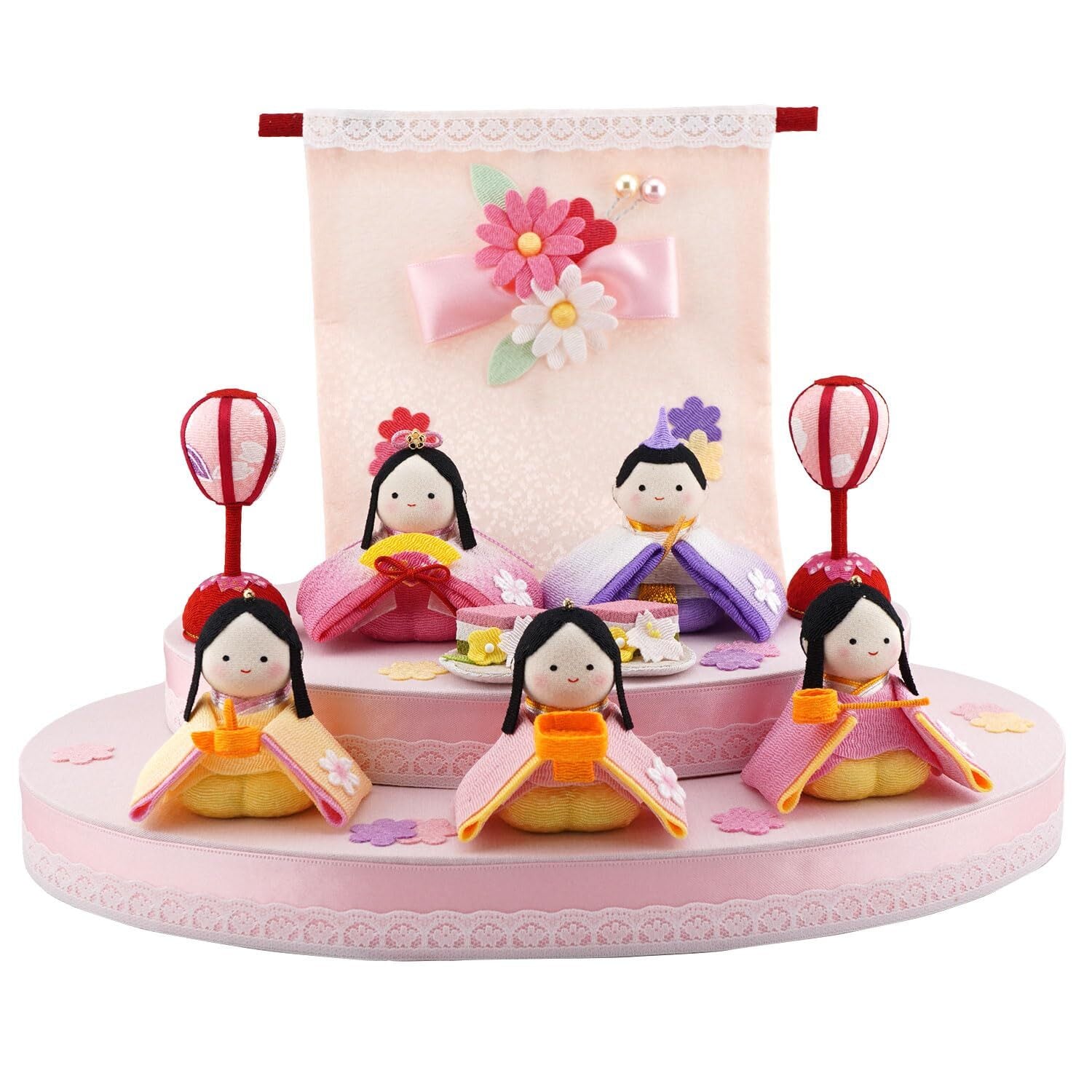 季節のインテリアとして手軽にお飾り頂けるコンパクトなおひなさま、親王と三人官女が揃った5人飾りです。 お花畑で仲良くお祝いしているような、やさしい色使い、お部屋が “ぱっ” と明るく雰囲気に! お人形のお袖には愛らしいおそろいのレースのお花の飾り レースのあしらいが可愛い几帳やケーキみたいな飾り台にもお花がいっぱい