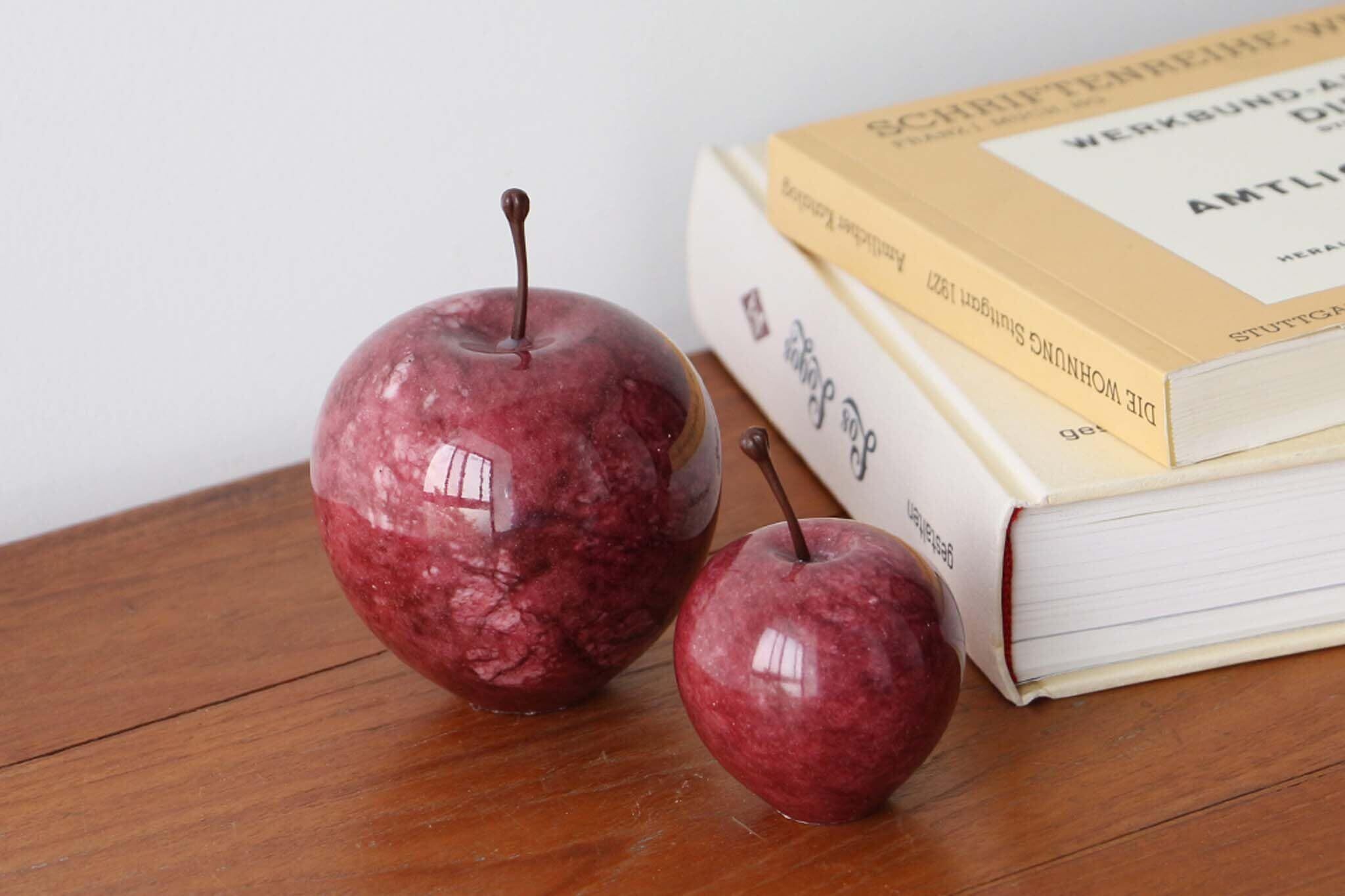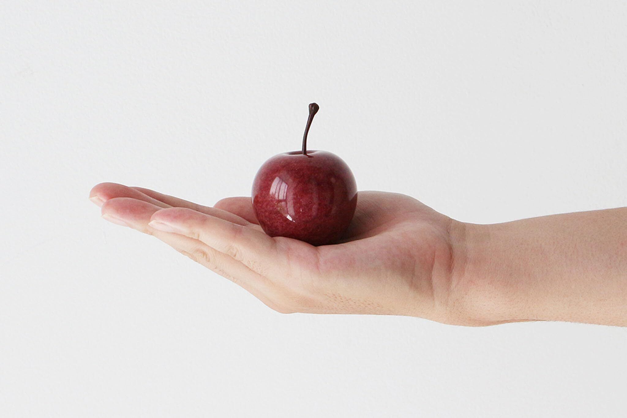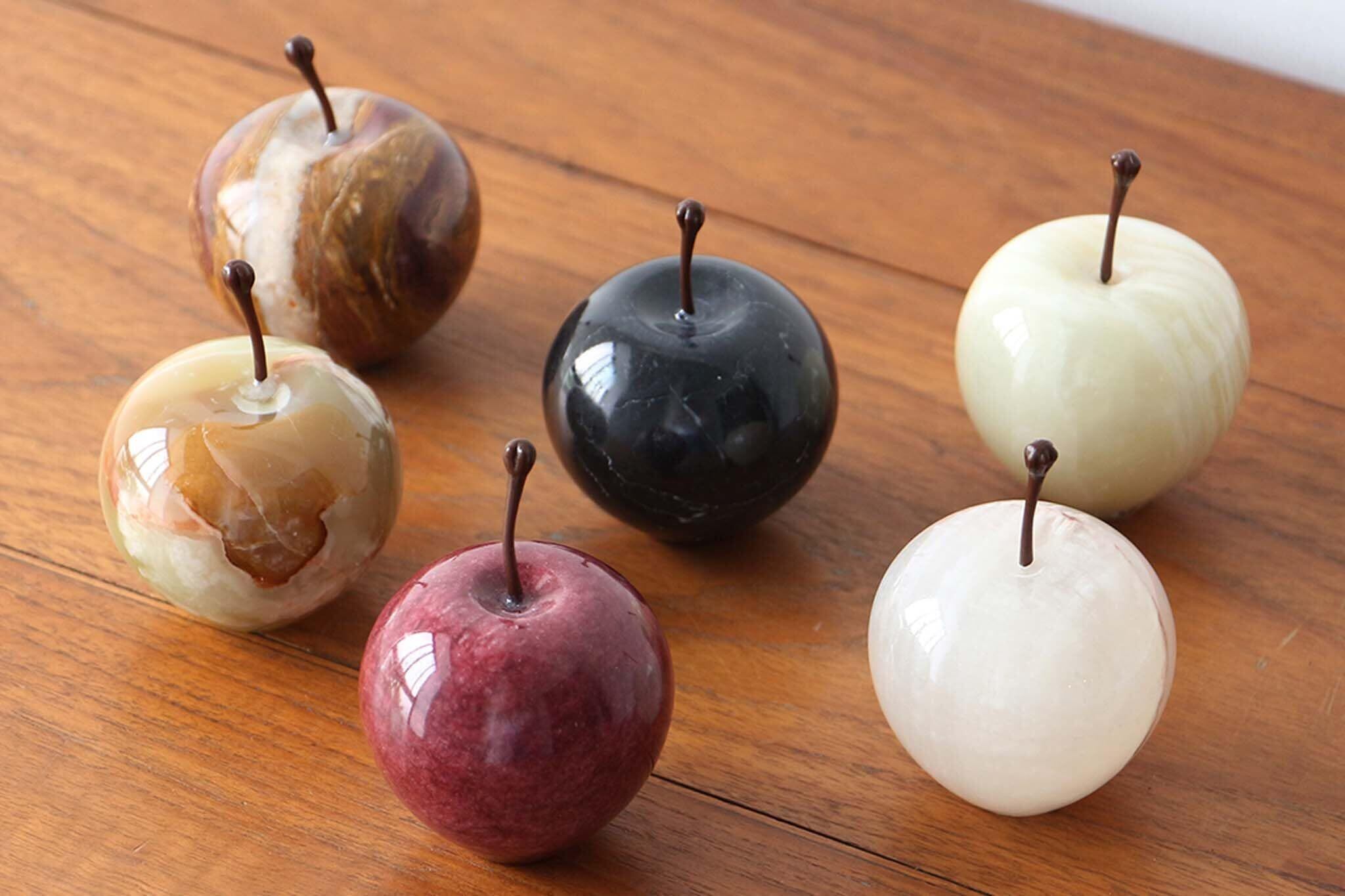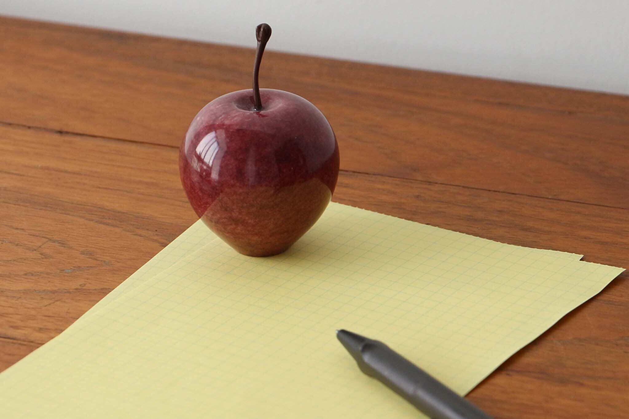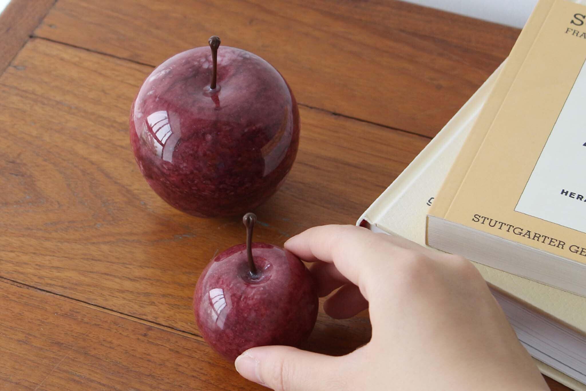 マーブルストーンを削り出して作られたアップルオブジェ。※こちらの商品は大理石を使用して作られているため、それぞれ模様や色合いが異なります。 商品画像と全く同じ商品はお届けできませんのであらかじめご了承ください。 ※ヘタの部分を持って持ち上げるとヘタが取れてしまうのでご注意ください。 ※本品は染色の都合上、直射日光等により退色することがありますのでお取り扱いにはご注意ください。 ※色落ちの原因となる為、アルコールやアルカリ性のクエン酸等を含んだ液体で拭いたり、手に液体がついた状態で触れないでください。