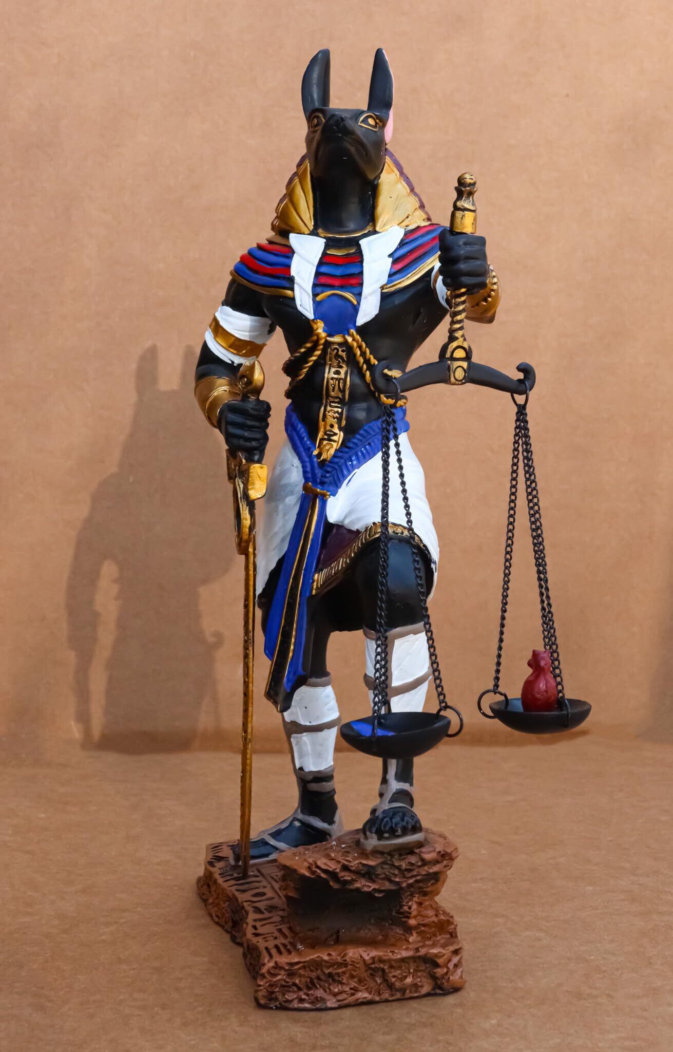亡くなった魂を深淵に導く正義の鱗と裁きの剣を手に立てて立ち、来世のアヌビスを描いたフィギュアです。 羽より重い魂はアンミットに食い尽くされ、羽よりも軽い魂は天の存在に上ります。 彼は神聖な象形文字の剣を持ち、正義の執行者であることを示しています。