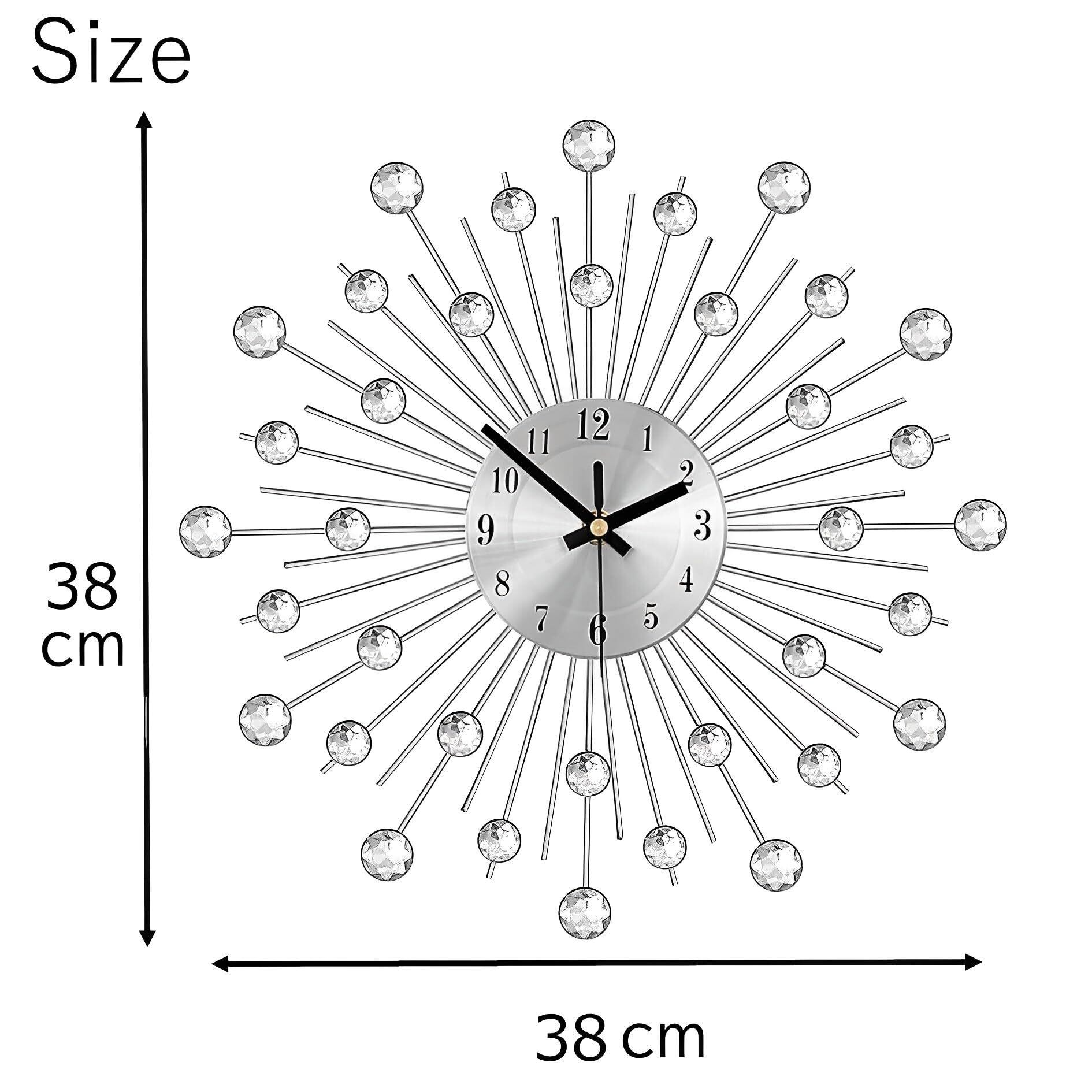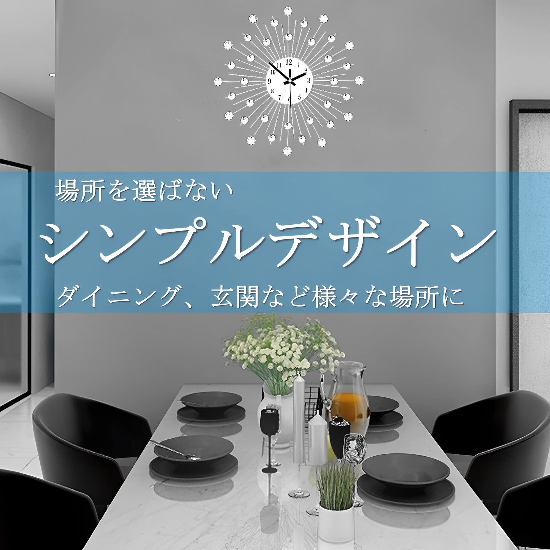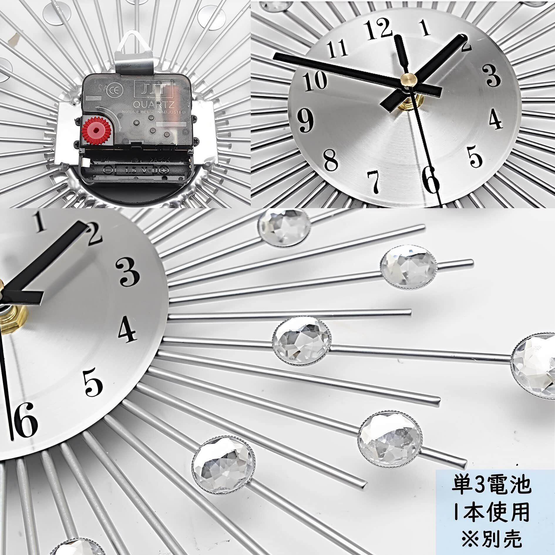 キラキラおしゃれ北欧風 静音タイプの壁掛け時計 キラキラストーンのついたゴージャスな静音タイプの壁掛け時計です。 豪華でエレガントなデザインなので、新築祝いやプレゼントにも喜ばれます。 ◎静音タイプ◎ 秒針はスイープ式を採用しており、秒針の音がせず静かなので勉強部屋や寝室に最適です。 ◎ムーブメント◎単三電池1個使用(電池は付属しません) 【バリエーション】フラワー・ゴールド 38cm*38cm 、フラワーブラック 38cm*38cm、スター・シルバー 33cm*33cm